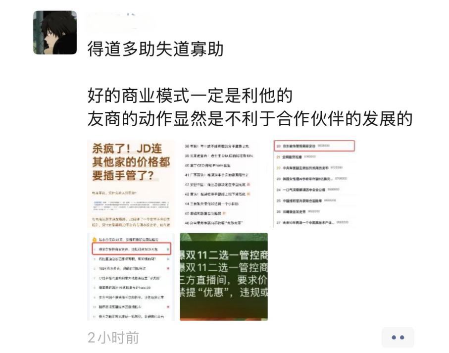 针对该高管声称的“得道者多助”,这位前京东采销反呛:“你收取商家高昂的费用,就是得道者吗?商家因为你高昂的费用,就要加价卖给消费者,你就是得道者了吗?这明显就是扣‘帽子’,栽赃给京东。”