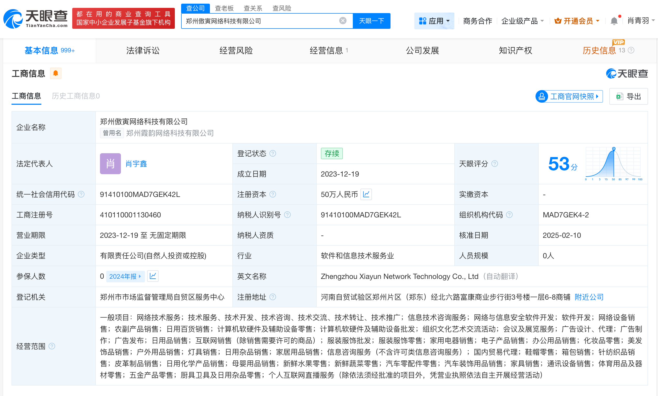 天眼查App显示,郑州傲寅网络科技有限公司成立于2023年12月,法定代表人为肖宇鑫,注册资本50万人民币,经营范围包括组织文化艺术交流活动、会议及展览服务等。