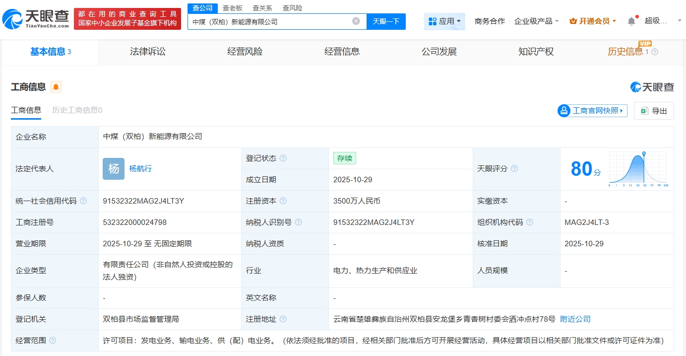 雷达财经讯,天眼查App显示,近日,中煤(双柏)新能源有限公司成立,法定代表人为杨航行,注册资本3500万人民币,经营范围为发电业务、输电业务、供(配)电业务,由中国中煤旗下中煤绿能科技(北京)有限公司全资持股。
