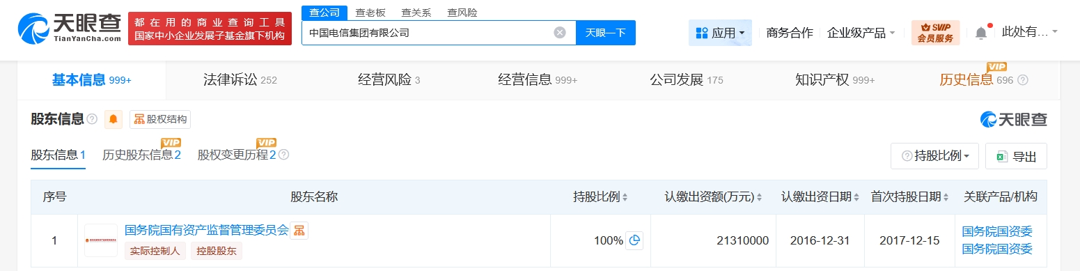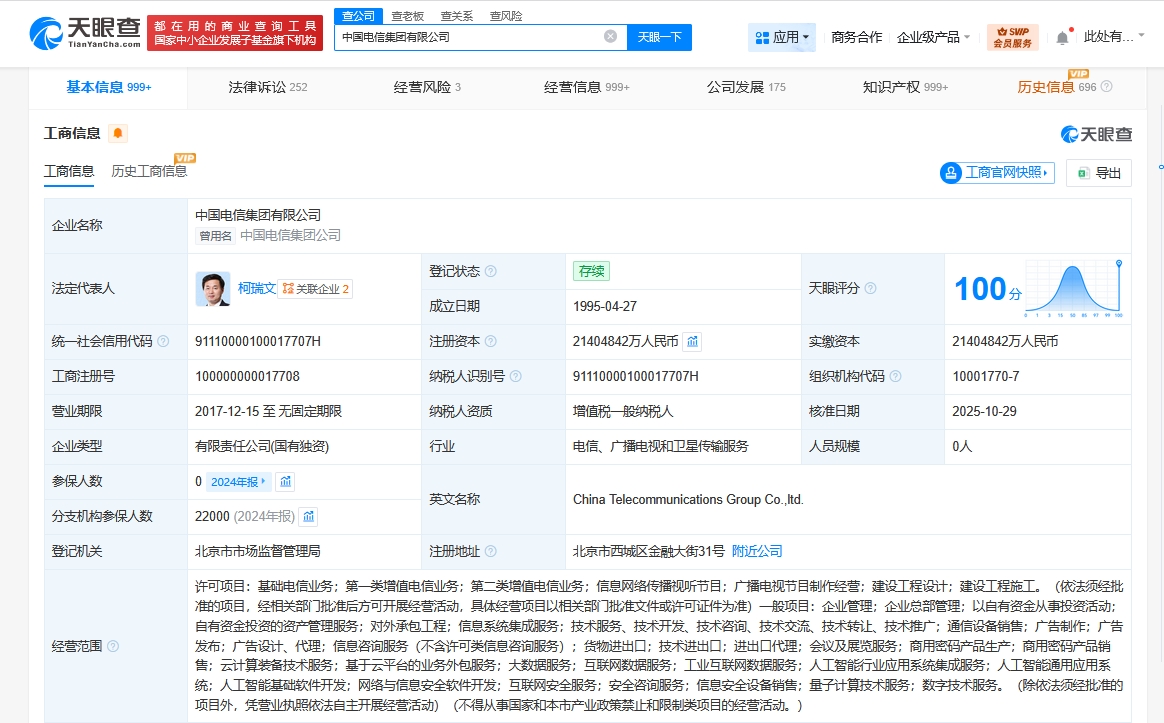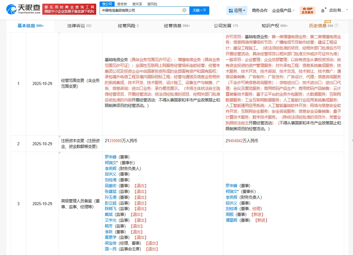 雷达财经讯,天眼查工商信息显示,近日,中国电信集团有限公司发生工商变更,注册资本由2131亿人民币增至约2140.5亿人民币,经营范围新增人工智能行业应用系统集成服务、人工智能通用应用系统、人工智能基础软件开发等,同时,多位高管发生变更。
