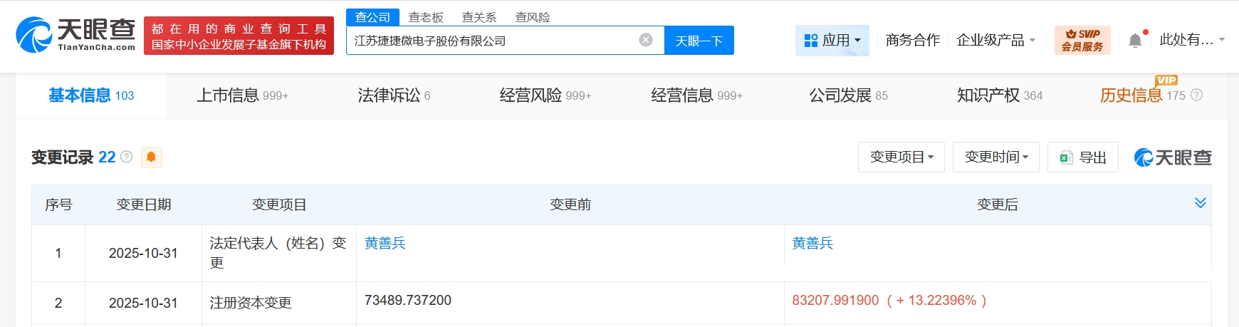 雷达财经讯,天眼查工商信息显示,近日,捷捷微电(300623)发生工商变更,注册资本由约7.35亿人民币增至约8.32亿人民币,增幅约13%。