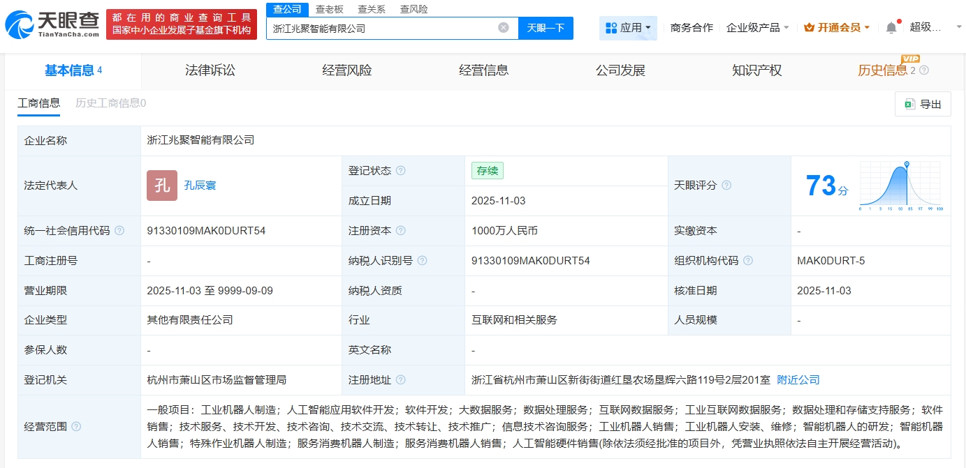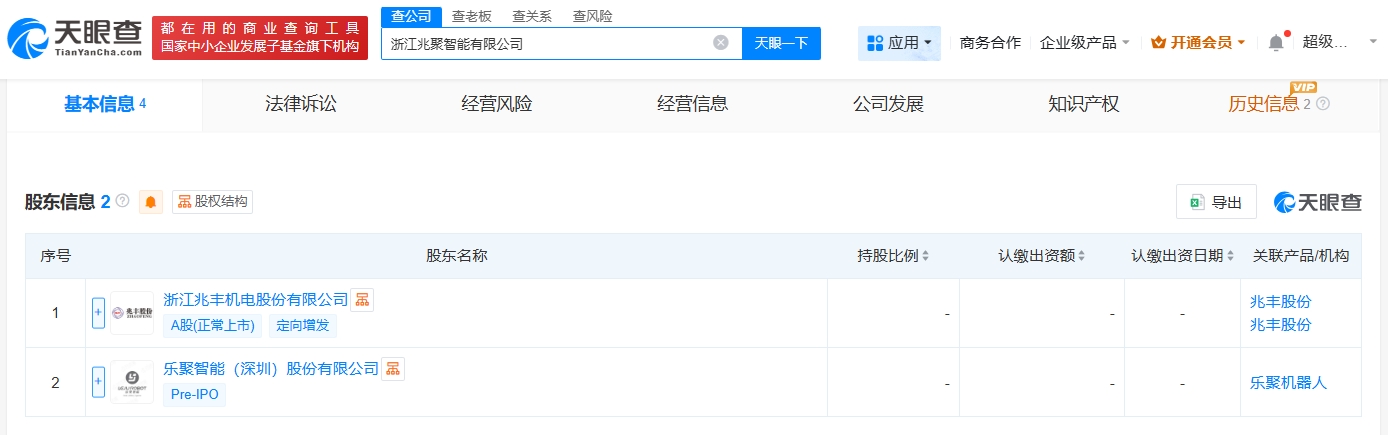 雷达财经讯,天眼查工商信息显示,近日,浙江兆聚智能有限公司成立,法定代表人为孔辰寰,注册资本1000万人民币,经营范围包括工业机器人制造、人工智能应用软件开发、大数据服务、数据处理服务、互联网数据服务等。股东信息显示,该公司由兆丰股份(300695)、乐聚智能(深圳)股份有限公司共同持股。
