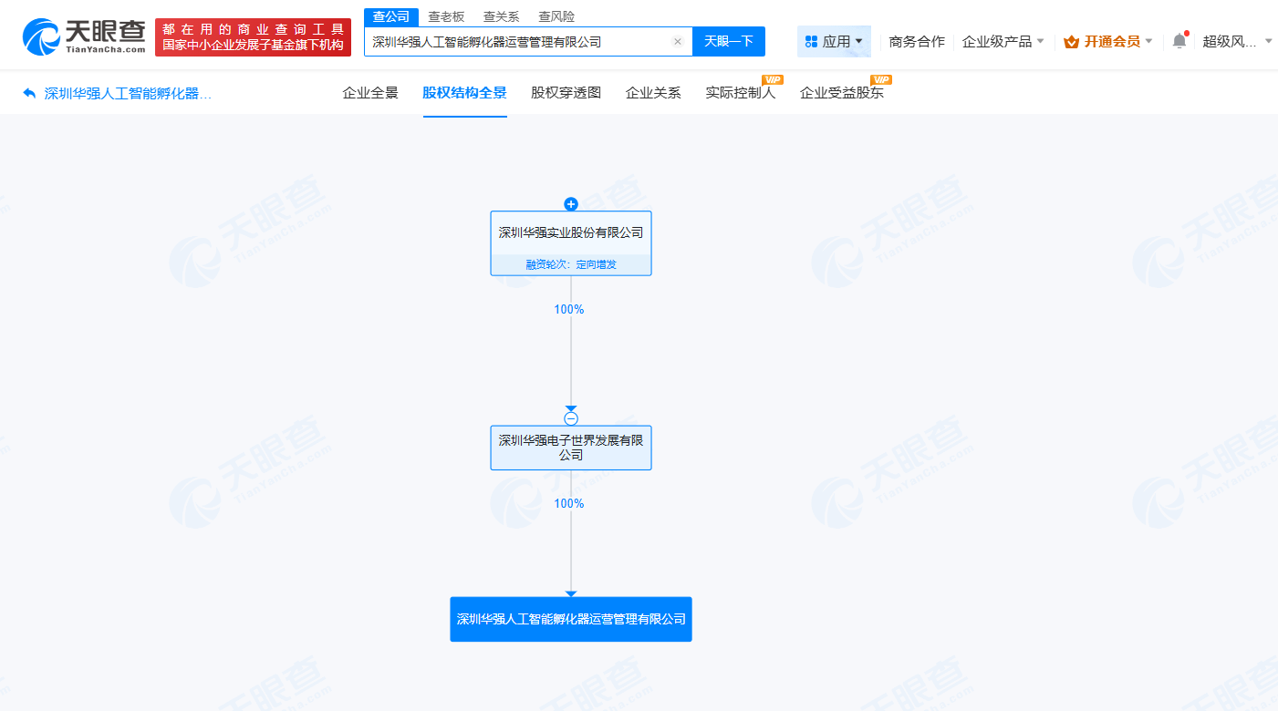 雷达财经讯,天眼查App显示,近日,深圳华强人工智能孵化器运营管理有限公司成立,法定代表人为陈辉军,注册资本2000万人民币,经营范围包括创业投资、以自有资金从事投资活动、自有资金投资的资产管理服务、非居住房地产租赁等。股权全景穿透图显示,该公司由深圳华强(000062)旗下深圳华强电子世界发展有限公司全资持股。