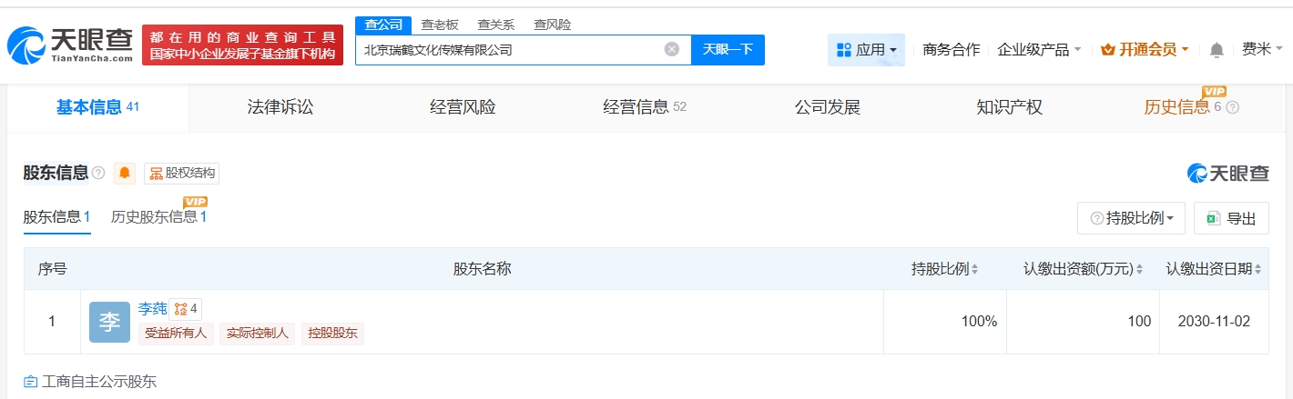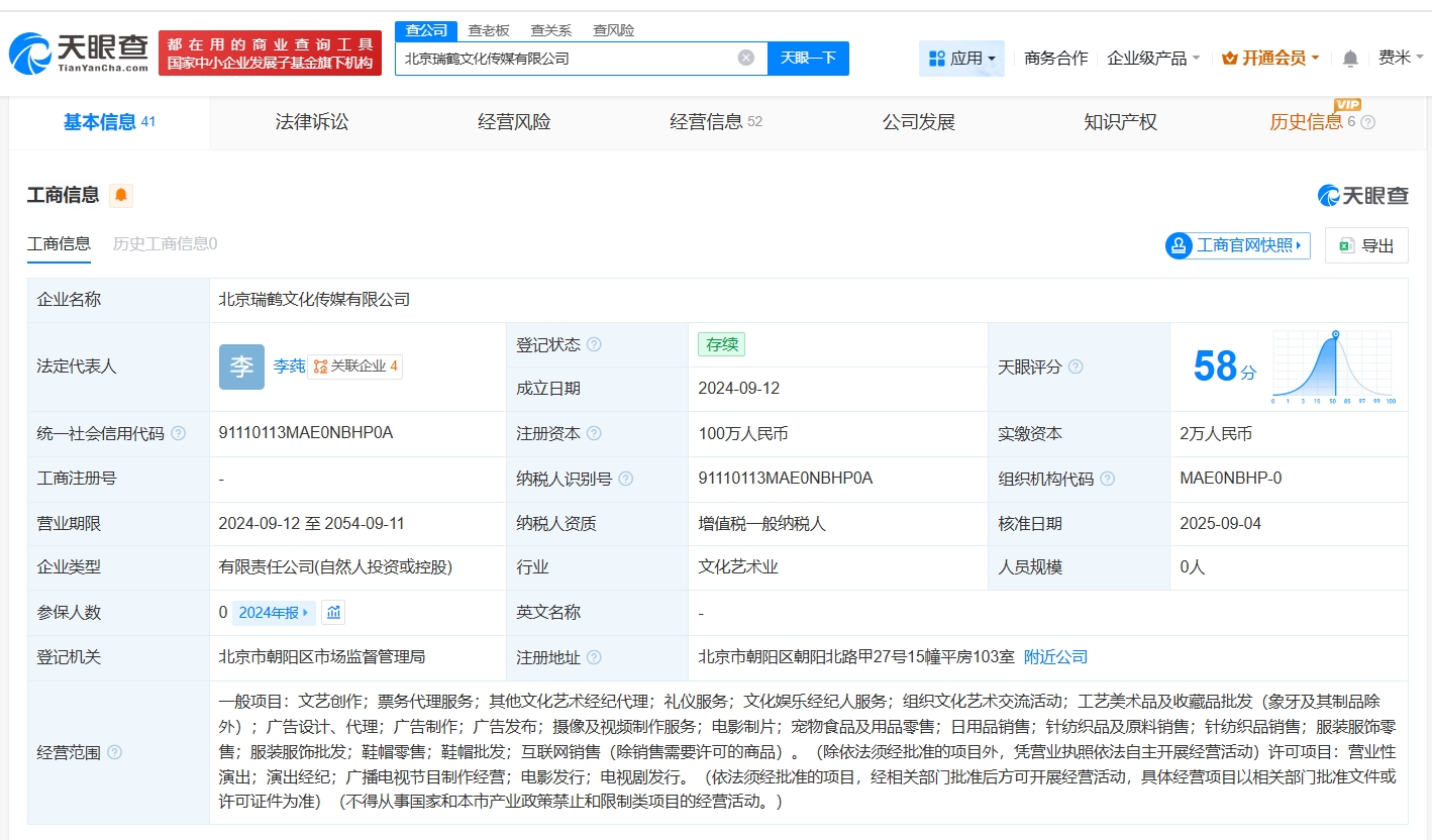 北京瑞鹤文化传媒有限公司成立于2024年9月,法定代表人为李莼,注册资本100万人民币,经营范围包括文艺创作、票务代理服务、其他文化艺术经纪代理等。股东信息显示,该公司现由李莼全资持股。变更记录显示,今年8月,该公司发生工商变更,郑朋(梓渝)卸任法定代表人、董事,由李莼接任,同时新增郑朋(梓渝)为股东,注册资本由10万人民币增至100万人民币。
