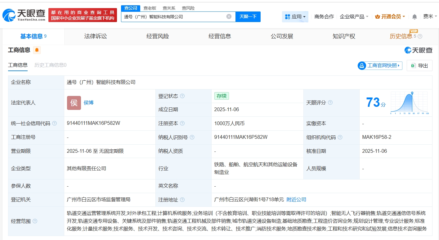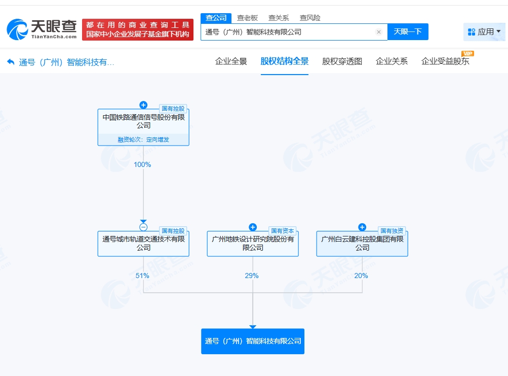 雷达财经讯,天眼查工商信息显示,近日,通号(广州)智能科技有限公司成立,法定代表人为侯博,注册资本1000万人民币,经营范围包括轨道交通运营管理系统开发、对外承包工程、计算机系统服务等。股权全景穿透图显示,该公司由中国通号(688009)旗下通号城市轨道交通技术有限公司、地铁设计(003013)、广州白云建科控股集团有限公司共同持股。