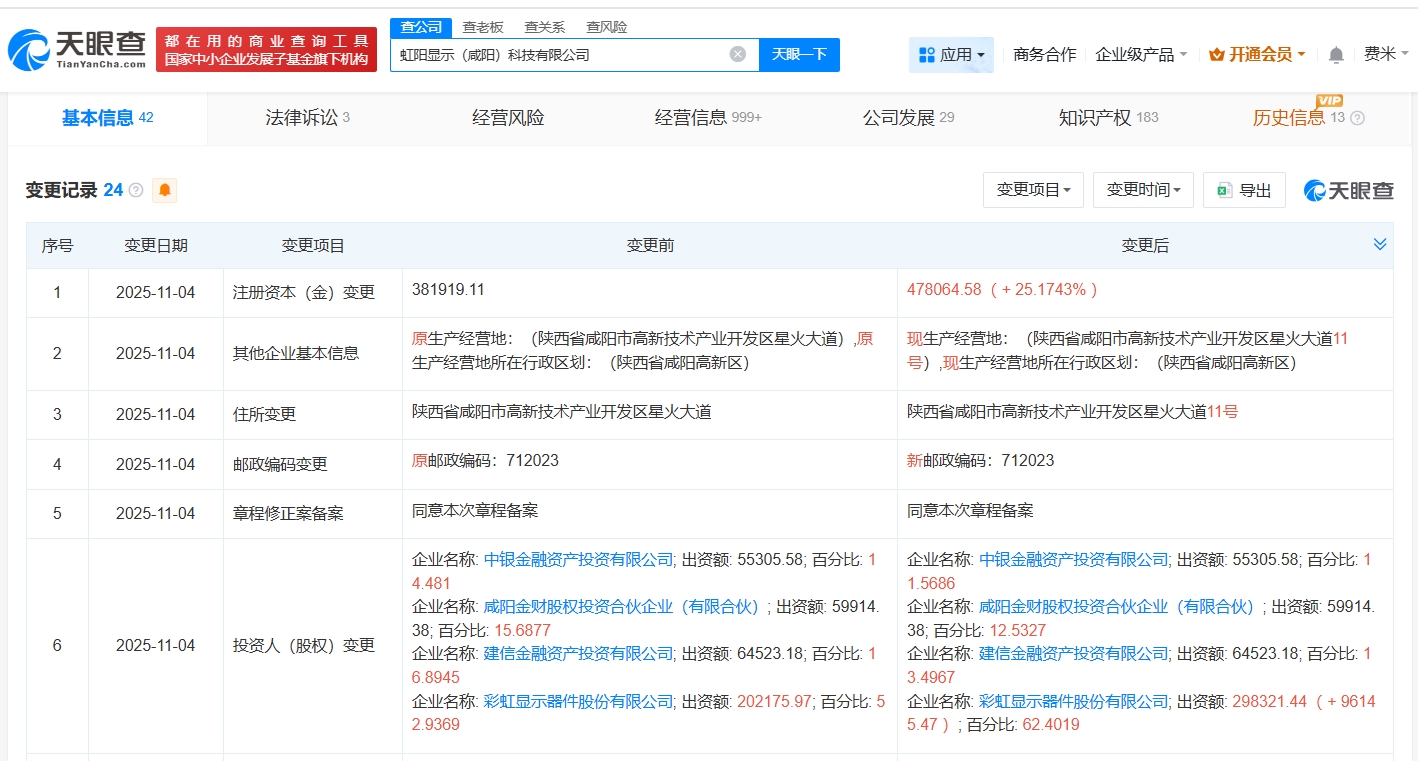 雷达财经讯,天眼查工商信息显示,近日,虹阳显示(咸阳)科技有限公司发生工商变更,注册资本由约38.2亿人民币增至约47.8亿人民币,增幅约25%。