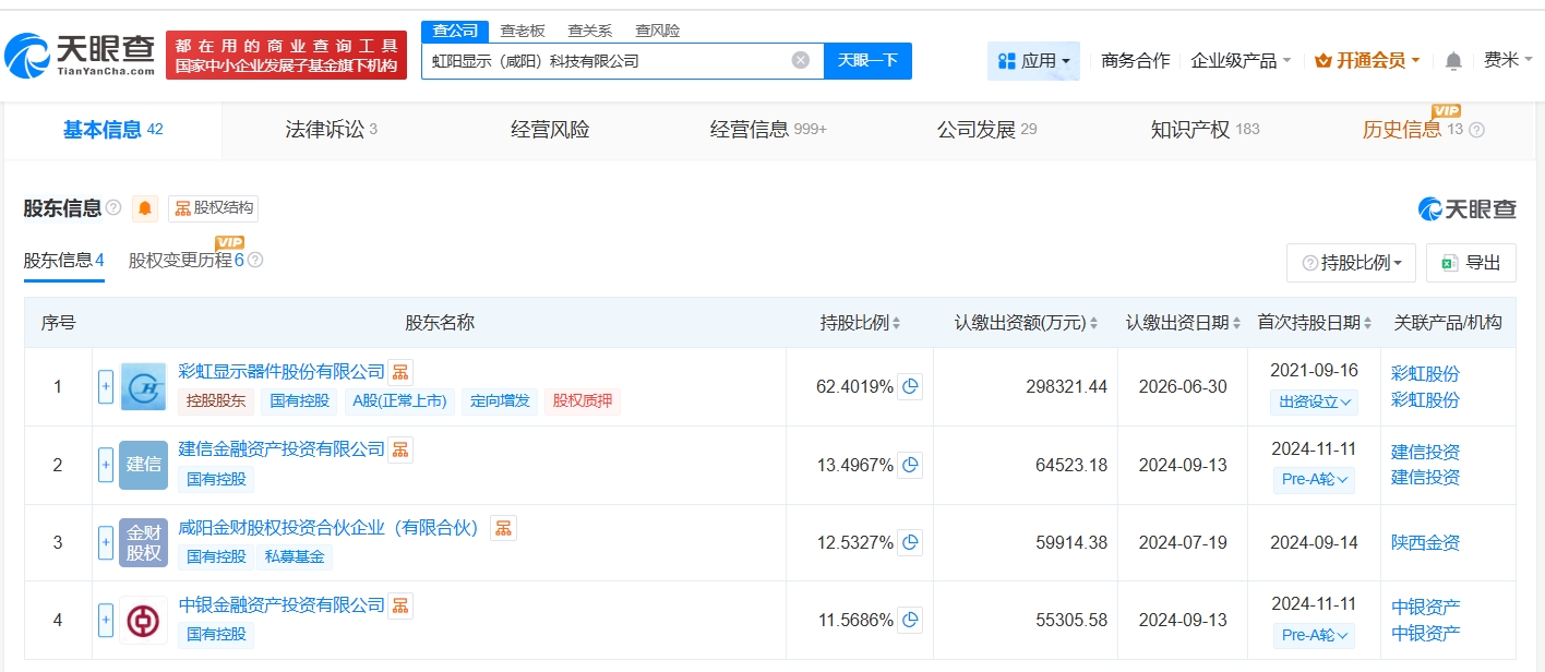 虹阳显示(咸阳)科技有限公司成立于2021年9月,法定代表人为刘琎,经营范围包括玻璃制造、非金属矿及制品销售、智能基础制造装备制造等。股东信息显示,该公司由彩虹股份(600707)、建信金融资产投资有限公司、咸阳金财股权投资合伙企业(有限合伙)、中银金融资产投资有限公司共同持股。