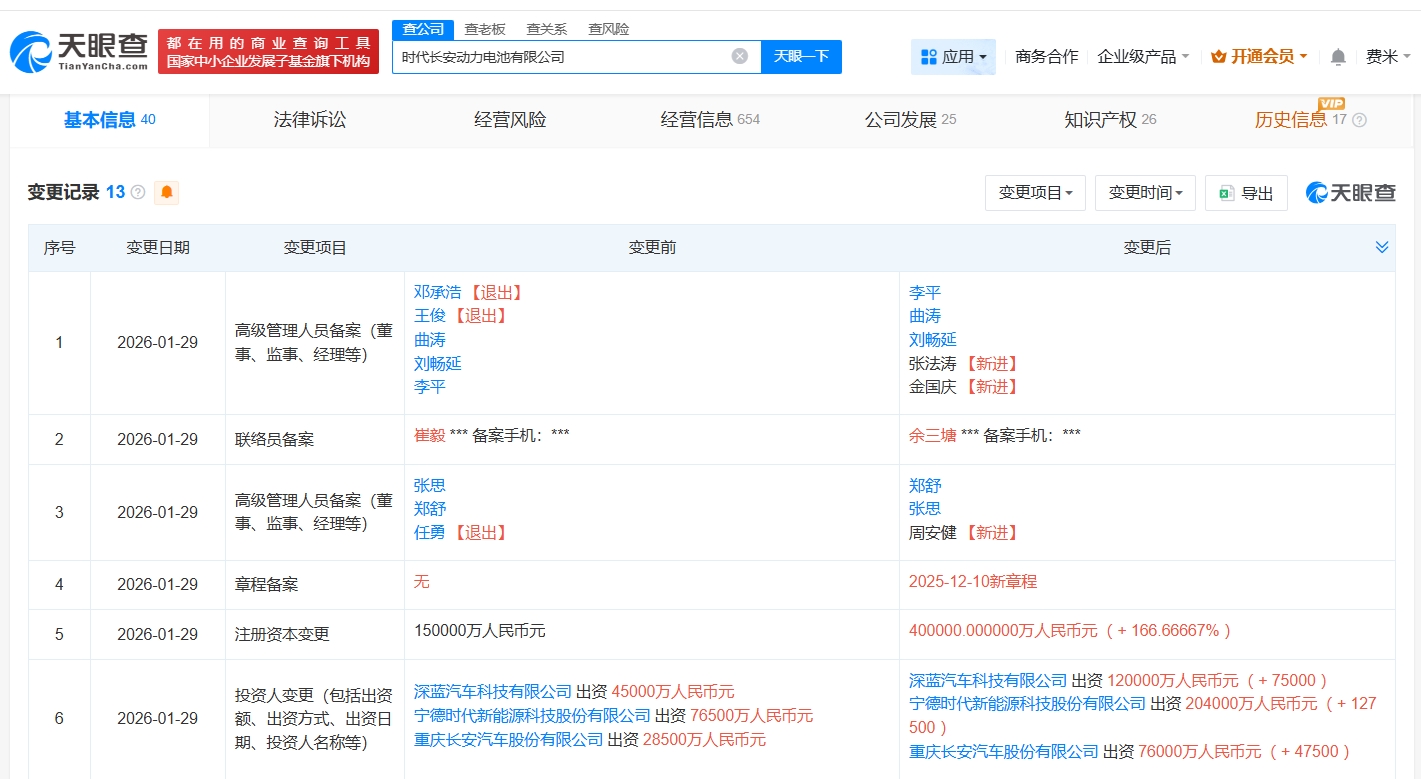 雷达财经讯,天眼查App显示,近日,时代长安动力电池有限公司发生工商变更,注册资本由15亿人民币增至40亿人民币,增幅约167%。
