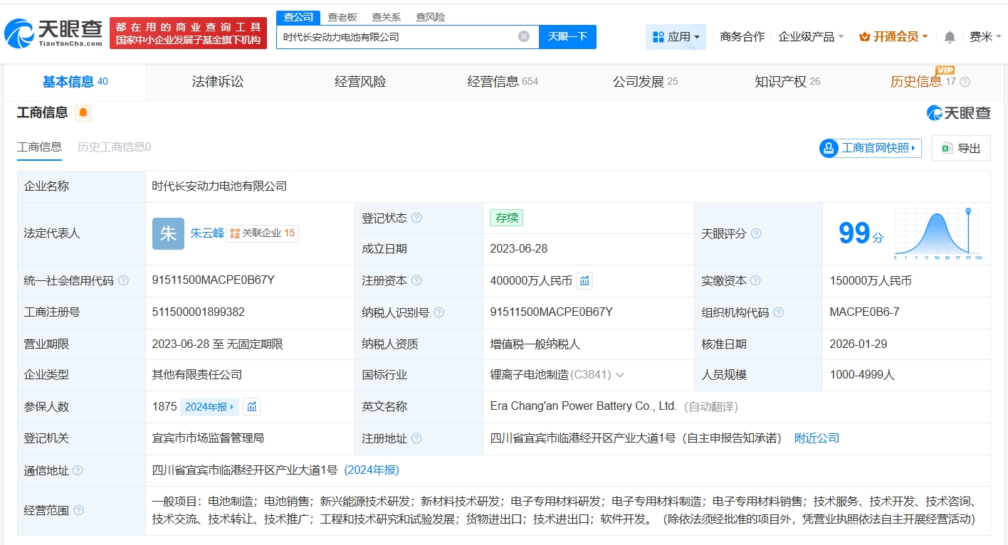时代长安动力电池有限公司成立于2023年6月,法定代表人为朱云峰,经营范围包括电池制造、电池销售、新兴能源技术研发、新材料技术研发等。股东信息显示,该公司由宁德时代(300750)、深蓝汽车科技有限公司、长安汽车(000625)共同持股。