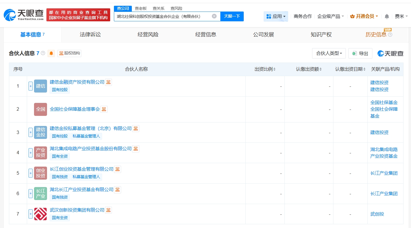 雷达财经讯,天眼查App显示,近日,湖北社保科创股权投资基金合伙企业(有限合伙)成立,执行事务合伙人为建信金投私募基金管理(北京)有限公司、长江创业投资基金管理有限公司,出资额200亿人民币,经营范围为创业投资,以私募基金从事股权投资、投资管理、资产管理等活动,由建信金融资产投资有限公司、全国社会保障基金理事会、湖北集成电路产业投资基金股份有限公司等共同出资。