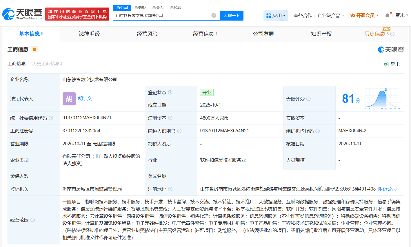 雷达财经讯,天眼查App显示,近日,山东铁投数字技术有限公司成立,法定代表人为胡宗文,注册资本4800万人民币,经营范围包括物联网技术服务、人工智能基础资源与技术平台、云计算设备销售等。股东信息显示,该公司由山东铁路投资控股集团有限公司全资持股。