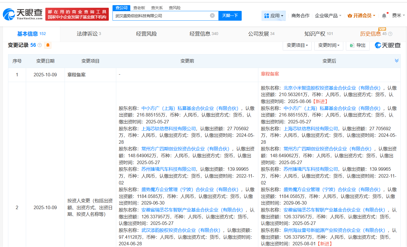 雷达财经讯,天眼查App显示,近日,武汉盛势启创科技有限公司发生工商变更,新增北京小米智造股权投资基金合伙企业(有限合伙)、泉州海丝壹号新能源产业投资合伙企业(有限合伙)为股东,同时注册资本由约2485万人民币增至约2822万人民币。