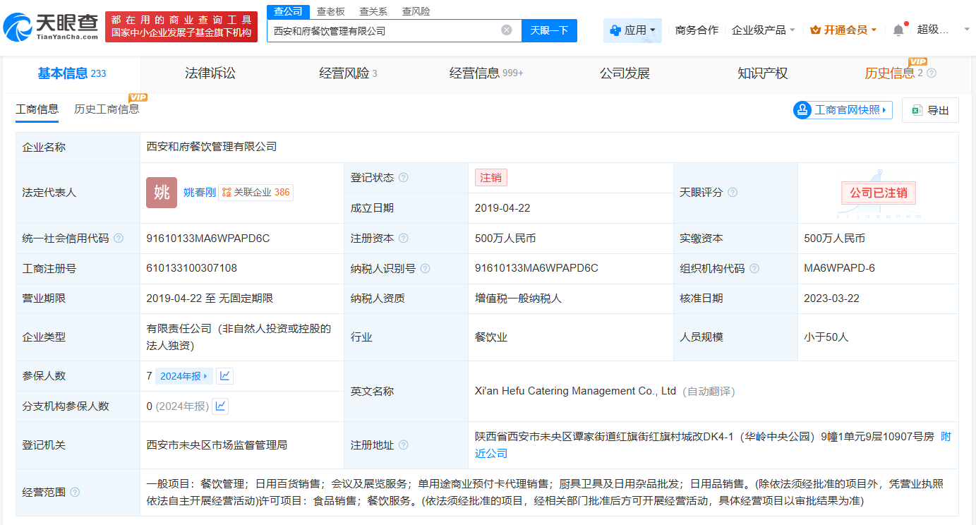 雷达财经讯,天眼查App显示,近日,西安和府餐饮管理有限公司登记状态变更为注销。此前,该公司已发布注销公告。