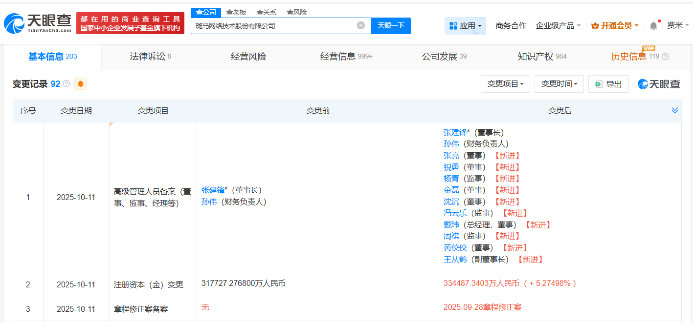 天眼查App显示,近日,斑马智行关联公司斑马网络技术股份有限公司发生工商变更,注册资本由约31.8亿人民币增至约33.4亿人民币,增幅约5%,同时新增多位高管…
