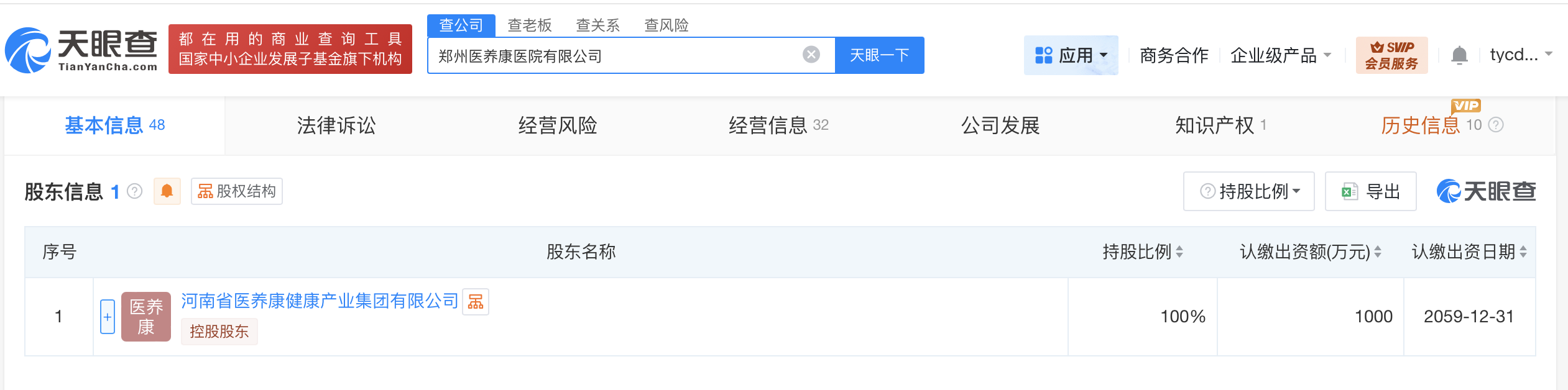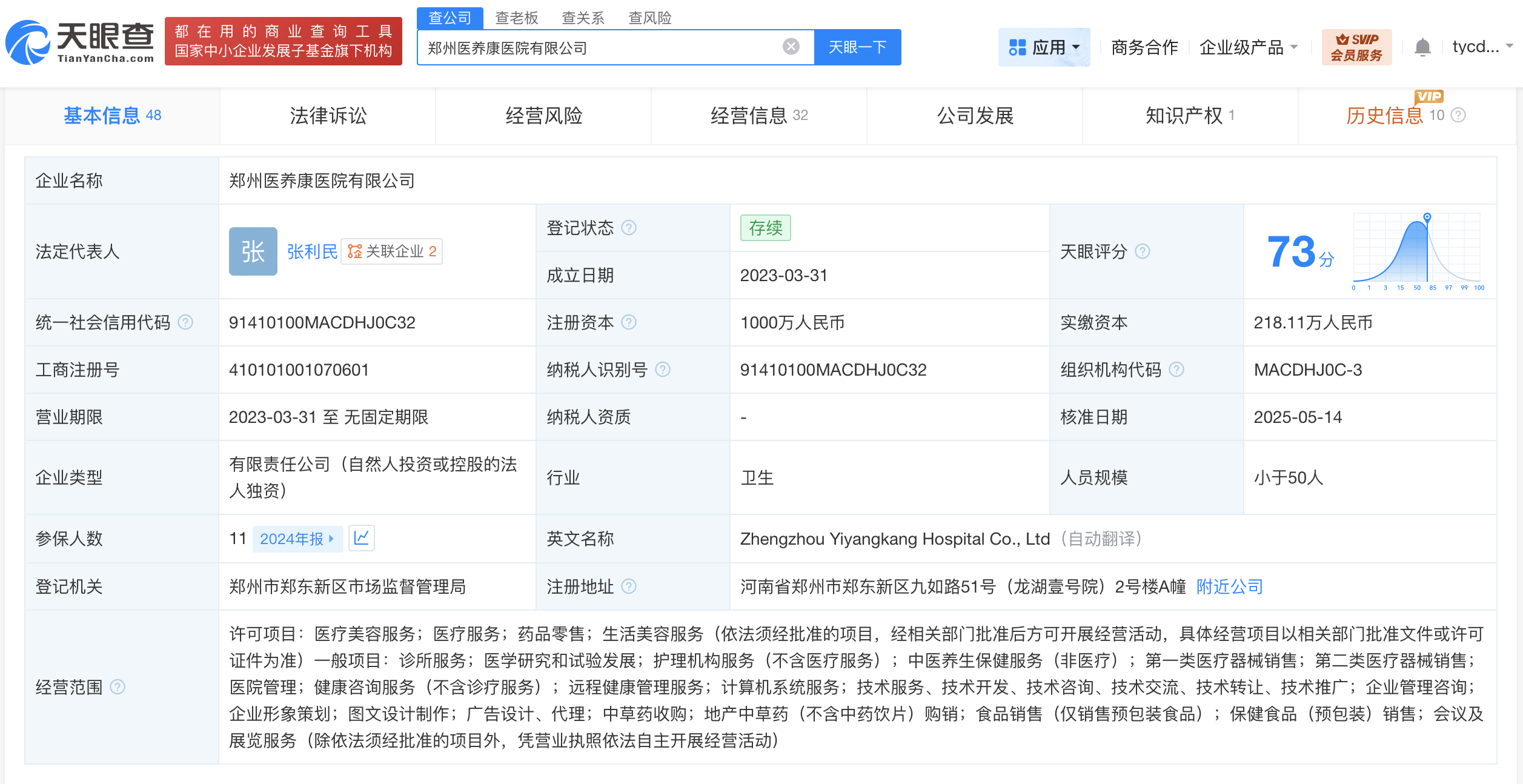 天眼查App显示,涉事的郑州医养康医院有限公司成立于2023年3月,法定代表人为张利民,注册资本1000万人民币,经营范围包括医疗美容服务、医疗服务、药品零售、中医养生保健服务(非医疗)等。股东信息显示,该公司由河南省医养康健康产业集团有限公司全资持股。变更记录显示,今年2月,张利民卸任该公司法定代表人、总经理、执行董事,由盛华伟任法定代表人、董事;今年5月,盛华伟卸任上述职务,由张利民接任。