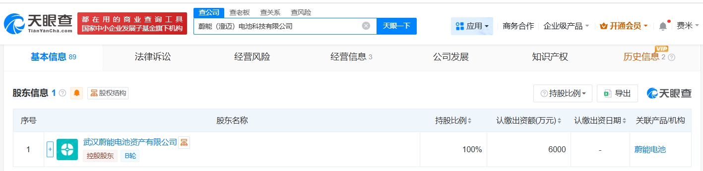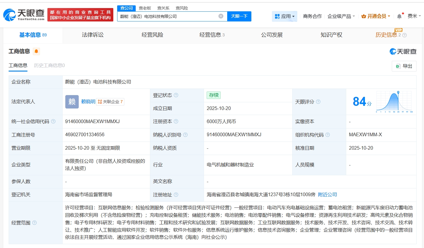 天眼查App显示,近日,蔚能(澄迈)电池科技有限公司成立,法定代表人为赖晓明,注册资本6000万人民币,经营范围包括电动汽车充电基础设施运营、蓄电池租赁、新能源汽车废旧动力蓄电池回收及梯次利用等。股东信息显示,该公司由武汉蔚能电池资产有限公…