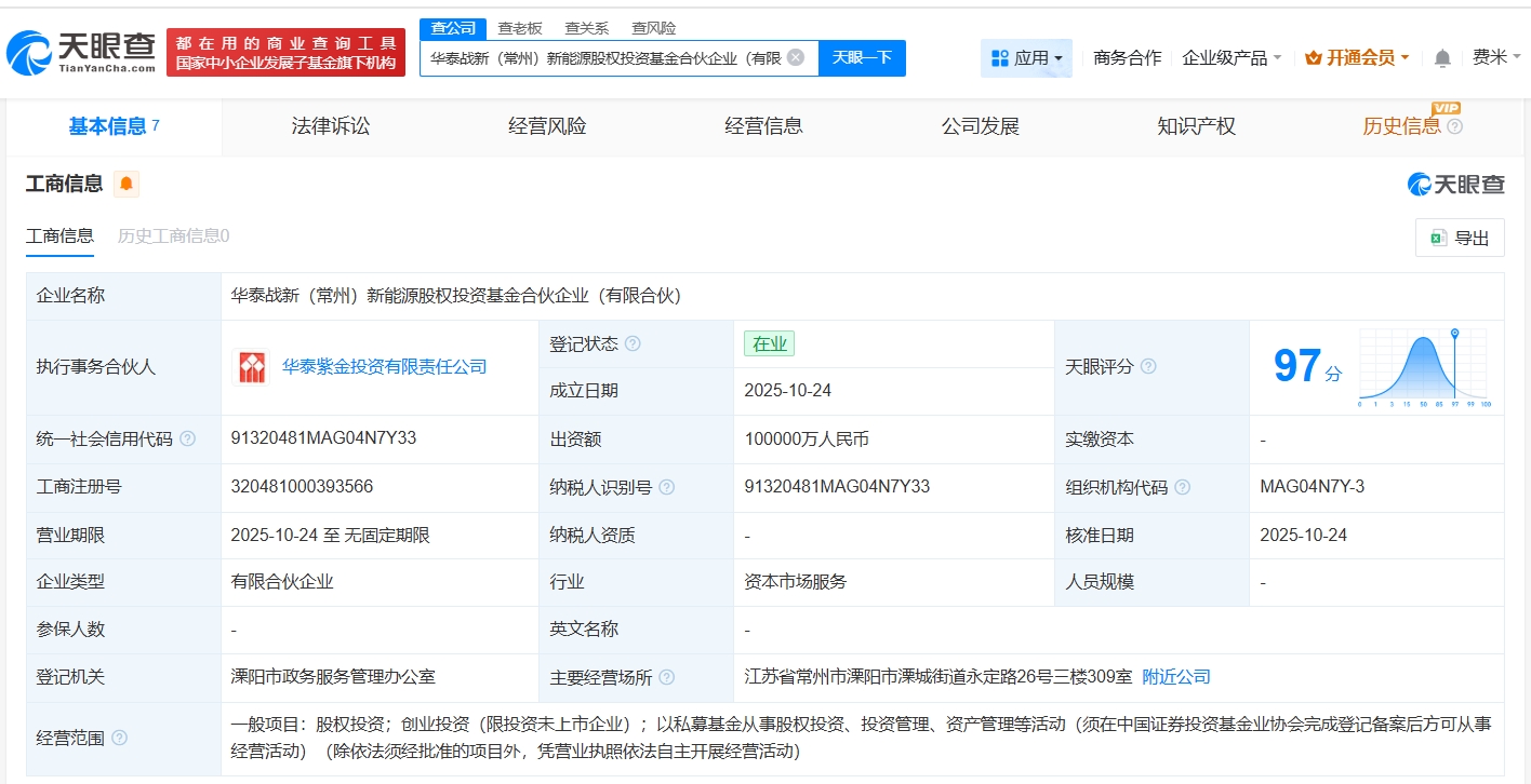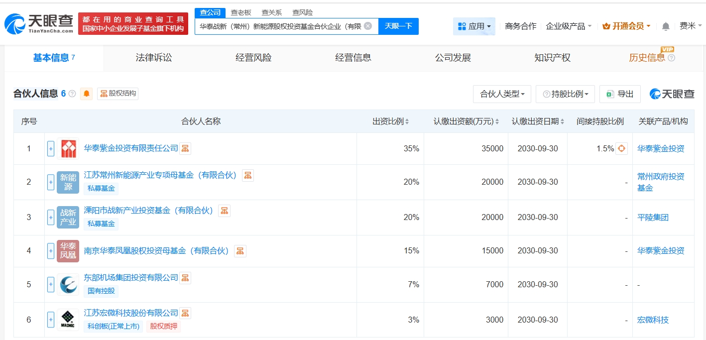 雷达财经讯,天眼查App显示,近日,华泰战新(常州)新能源股权投资基金合伙企业(有限合伙)成立,执行事务合伙人为华泰紫金投资有限责任公司,出资额10亿人民币,经营范围为股权投资,创业投资,以私募基金从事股权投资、投资管理、资产管理等活动,由华泰证券(601688)旗下华泰紫金投资有限责任公司、宏微科技(688711)、江苏常州新能源产业专项母基金(有限合伙)等共同出资。