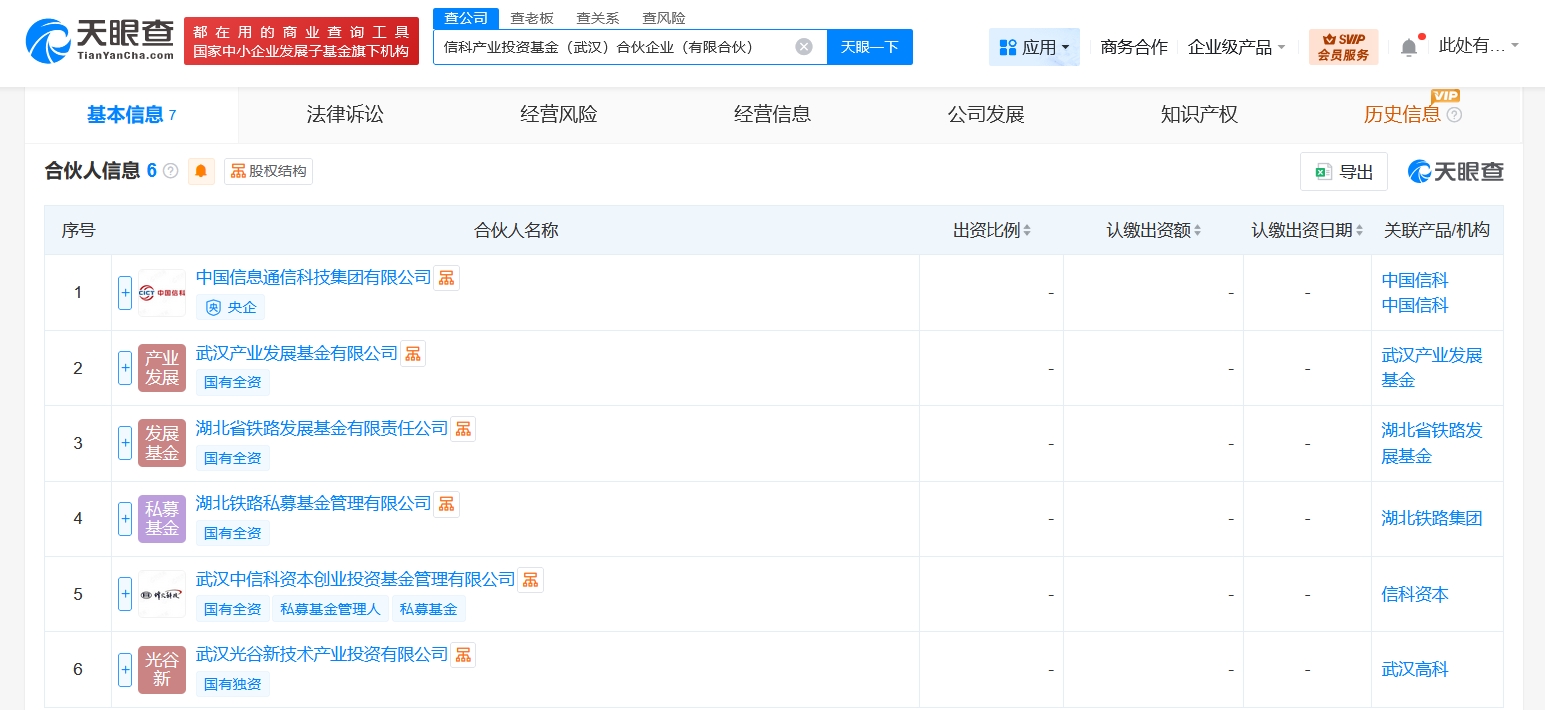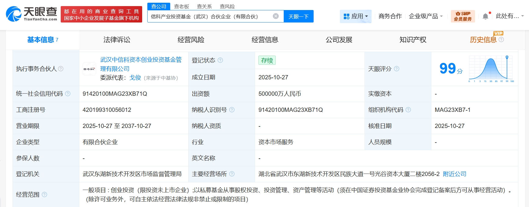 雷达财经讯,天眼查工商信息显示,近日,信科产业投资基金(武汉)合伙企业(有限合伙)成立,执行事务合伙人为武汉中信科资本创业投资基金管理有限公司,出资额50亿人民币,经营范围为创业投资,以私募基金从事股权投资、投资管理、资产管理等活动。合伙人信息显示,该基金由中国信息通信科技集团有限公司、武汉产业发展基金有限公司、湖北省铁路发展基金有限责任公司等共同出资。