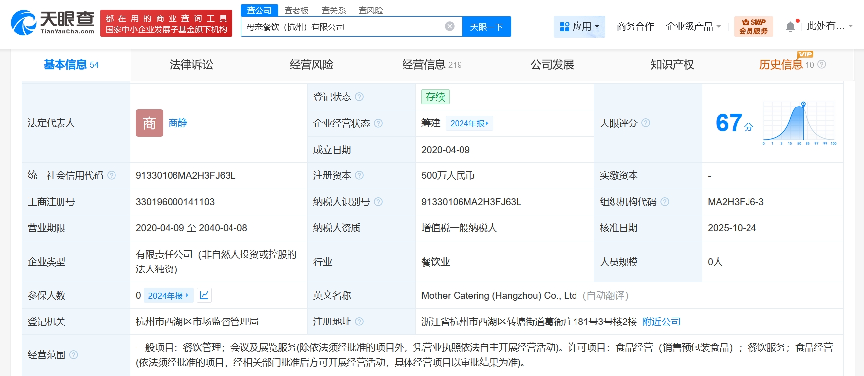 该公司成立于2020年4月,注册资本500万人民币,经营范围为餐饮管理、会议及展览服务、食品经营、餐饮服务等。股东信息显示,该公司由养生堂旗下母亲食品(安吉)有限公司全资持股。