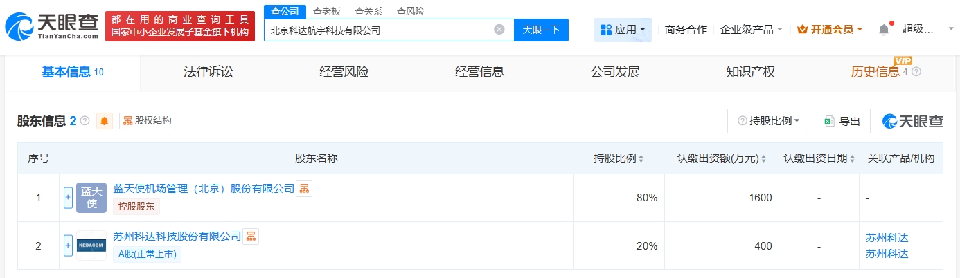 雷达财经讯,天眼查App显示,近日,北京科达航宇科技有限公司成立,法定代表人为陈卫东,注册资本2000万人民币,经营范围包括人工智能基础软件开发、智能无人飞行器制造、服务消费机器人销售等。股东信息显示,该公司由蓝天使机场管理(北京)股份有限公司、苏州科达(603660)共同持股。