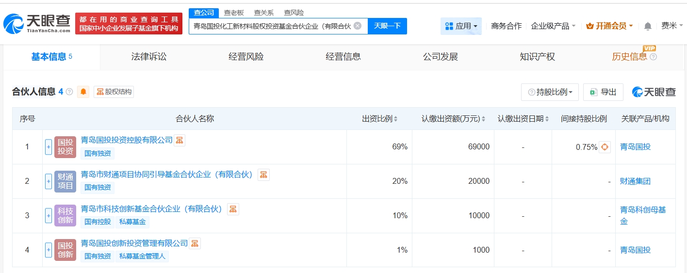 雷达财经讯,天眼查App显示,近日,青岛国投化工新材料股权投资基金合伙企业(有限合伙)成立,执行事务合伙人为青岛国投创新投资管理有限公司,出资额10亿人民币,经营范围为以私募基金从事股权投资、投资管理、资产管理等活动,由青岛国投投资控股有限公司、青岛市财通项目协同引导基金合伙企业(有限合伙)、青岛市科技创新基金合伙企业(有限合伙)、青岛国投创新投资管理有限公司共同出资。