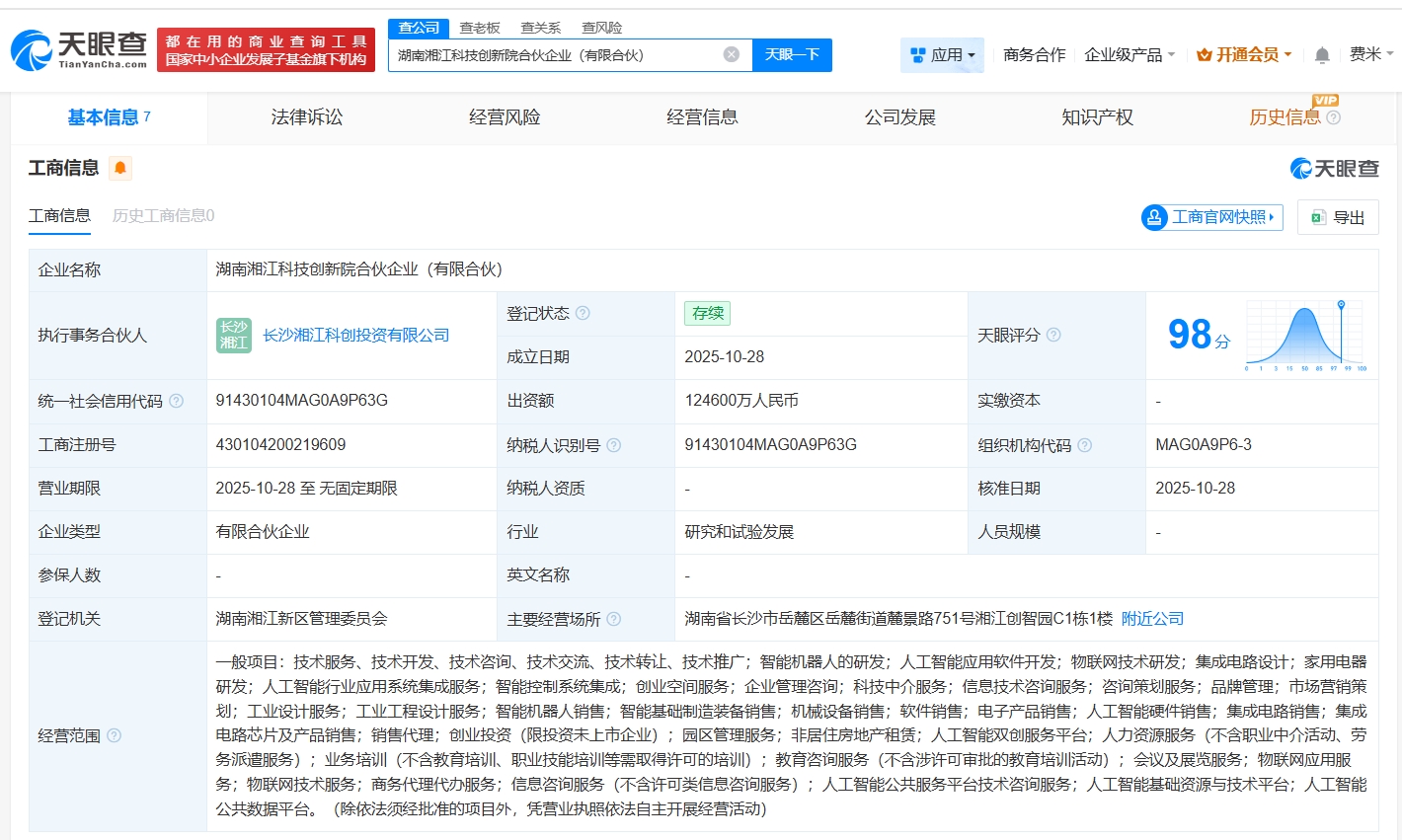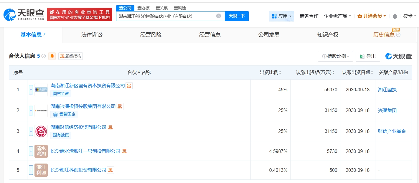雷达财经讯,天眼查App显示,近日,湖南湘江科技创新院合伙企业(有限合伙)成立,执行事务合伙人为长沙湘江科创投资有限公司,出资额12.46亿人民币,经营范围包括人工智能应用软件开发、人工智能行业应用系统集成服务、人工智能硬件销售等,由湖南湘江新区国有资本投资有限公司、湖南兴湘投资控股集团有限公司、湖南财信经济投资有限公司等共同出资。