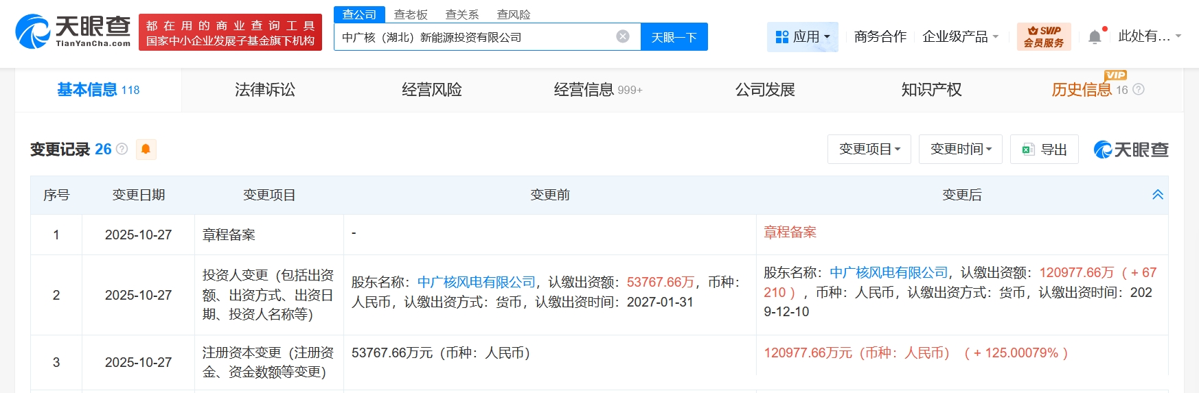 雷达财经讯,天眼查App显示,近日,中广核(湖北)新能源投资有限公司发生工商变更,注册资本由约5.4亿人民币增至约12.1亿人民币,增幅约125%。
