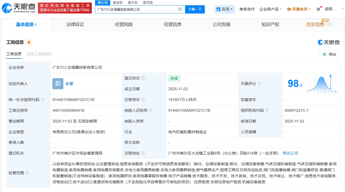 雷达财经讯,天眼查工商信息显示,近日,广东TCL空调器控股有限公司成立,法定代表人、董事、经理为彭攀,注册资本约18.18亿人民币,经营范围包括以自有资金从事投资活动、家用电器制造、家用电器研发等。股东信息显示,该公司由TCL AeroWell (HK) Holdings Limited全资持股。
