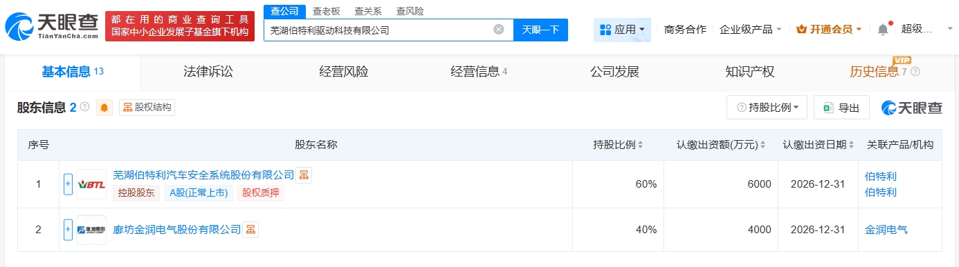 雷达财经讯,天眼查App显示,近日,芜湖伯特利驱动科技有限公司成立,法定代表人为梅荣军,注册资本1亿人民币,经营范围包括电机及其控制系统研发、电机制造、智能机器人的研发、工业机器人制造等。股东信息显示,该公司由伯特利(603596)、廊坊金润电气股份有限公司共同持股。