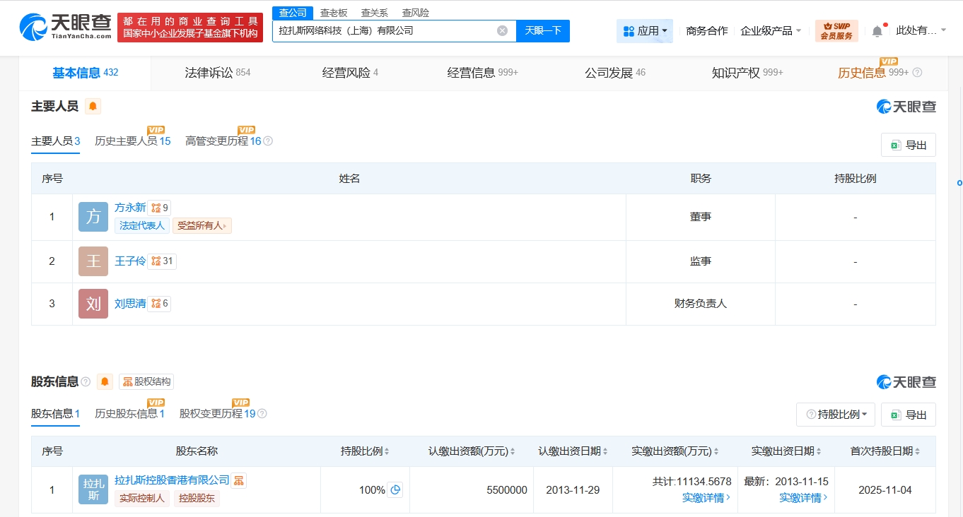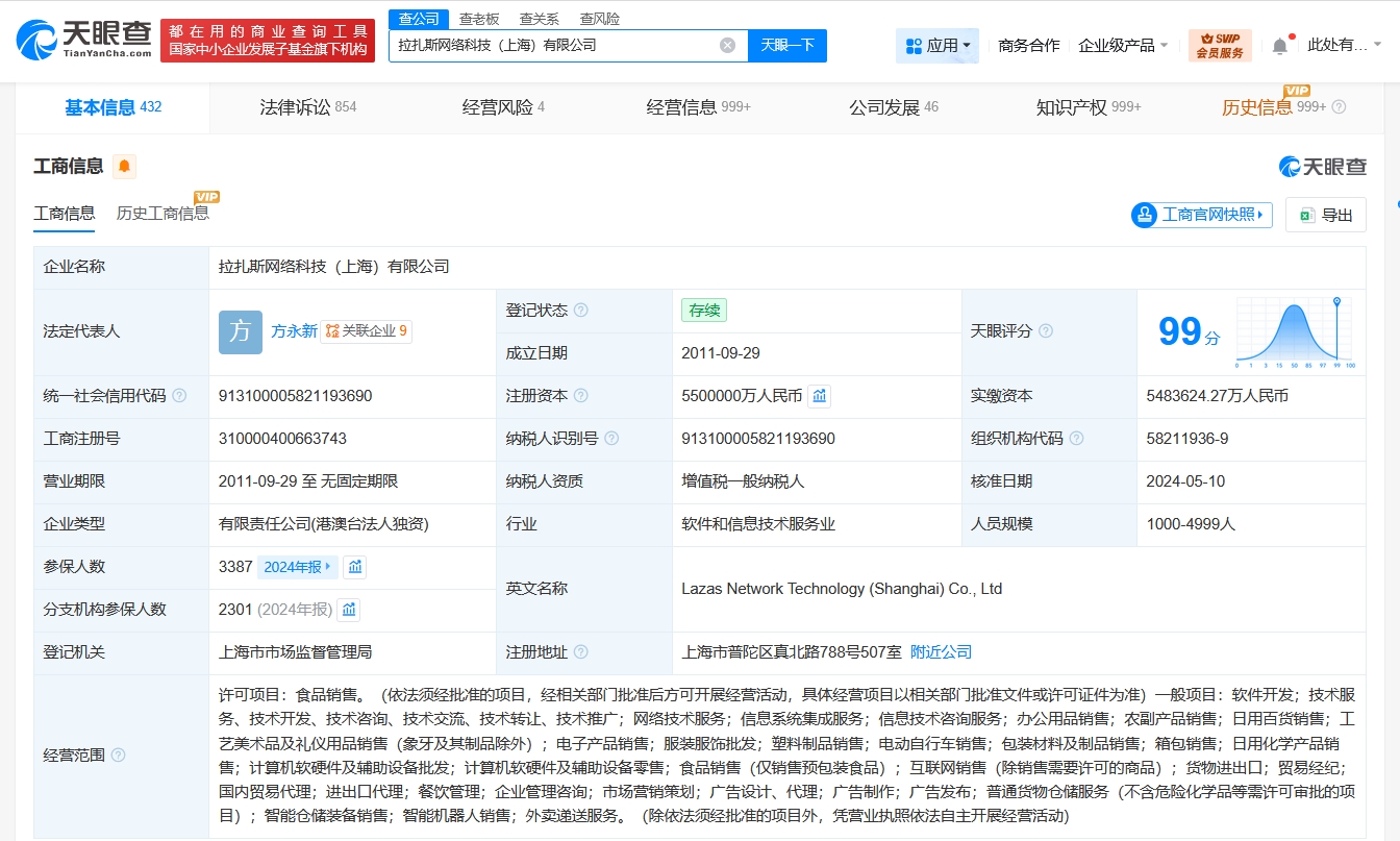 该公司成立于2011年9月,法定代表人为方永新,注册资本550亿人民币,经营范围含食品销售、软件开发、网络技术服务、信息系统集成服务、信息技术咨询服务、农副产品销售、日用百货销售、互联网销售等。股东信息显示,该公司由拉扎斯控股香港有限公司全资持股。