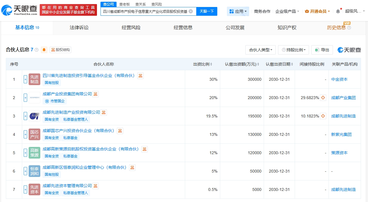 雷达财经讯,天眼查App显示,近日,四川省成都市产投电子信息重大产业化项目股权投资基金合伙企业(有限合伙)成立,执行事务合伙人为成都先进资本管理有限公司,出资额100亿人民币,经营范围包括以私募基金从事股权投资、投资管理、资产管理等活动。合伙人信息显示,该基金由四川省先进制造投资引导基金合伙企业(有限合伙)、成都产业投资集团有限公司、成都先进制造产业投资有限公司等共同出资。