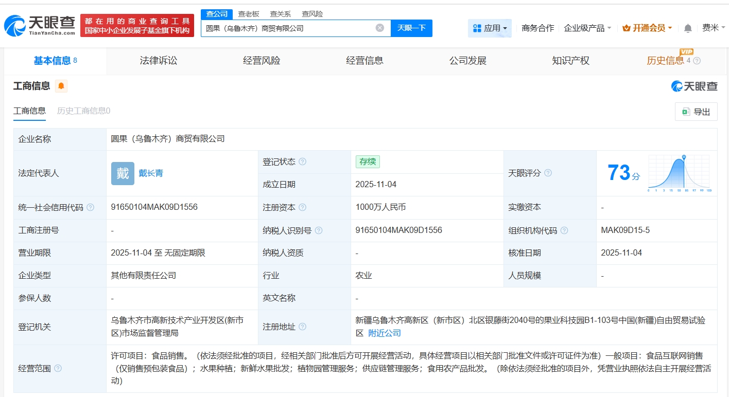 雷达财经讯,天眼查工商信息显示,近日,圆果(乌鲁木齐)商贸有限公司成立,法定代表人为戴长青,注册资本1000万人民币,经营范围包括食品销售、食品互联网销售、水果种植等。股东信息显示,该公司由圆通速递有限公司、新疆果业集团有限公司、青田中智物产贸易有限公司共同持股。