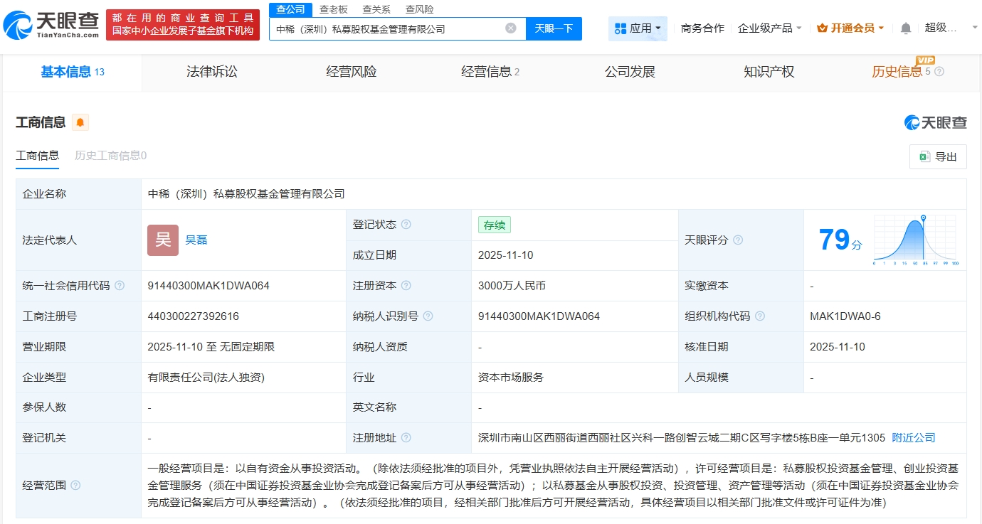 天眼查工商信息显示,近日,中稀(深圳)私募股权基金管理有限公司成立,法定代表人为吴磊,注册资本3000万人民币,经营范围包括以自有资金从事投资活动、私募股权投资基金管理、创业投资基金管理服务等。股东信息显示,该公司由中国稀土集团创新科技有限…