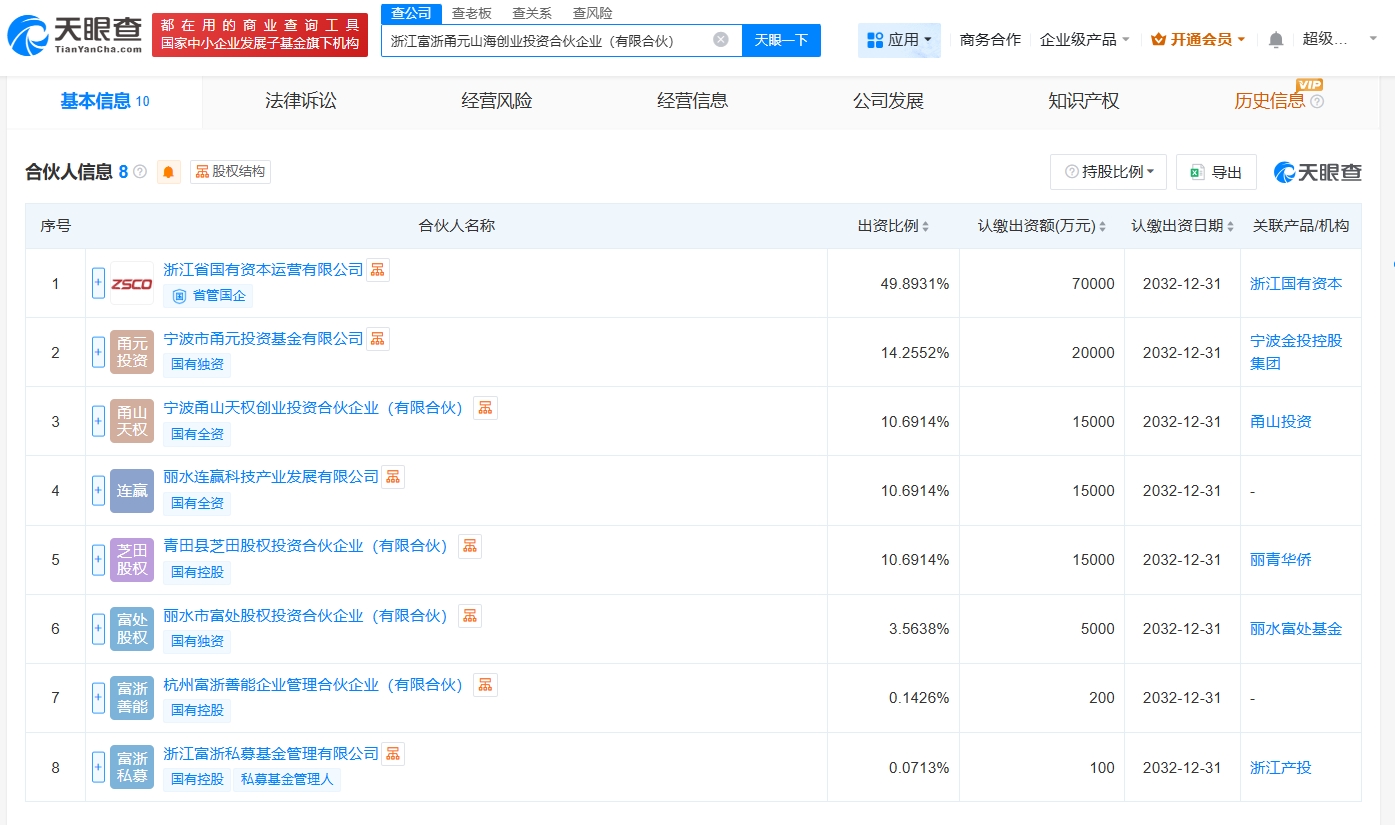 雷达财经讯,天眼查工商信息显示,近日,浙江富浙甬元山海创业投资合伙企业(有限合伙)成立,执行事务合伙人为浙江富浙私募基金管理有限公司,出资额14.03亿人民币,经营范围为创业投资、股权投资。合伙人信息显示,该合伙企业浙江省国有资本运营有限公司、宁波市甬元投资基金有限公司、浙江富浙私募基金管理有限公司等共同出资。