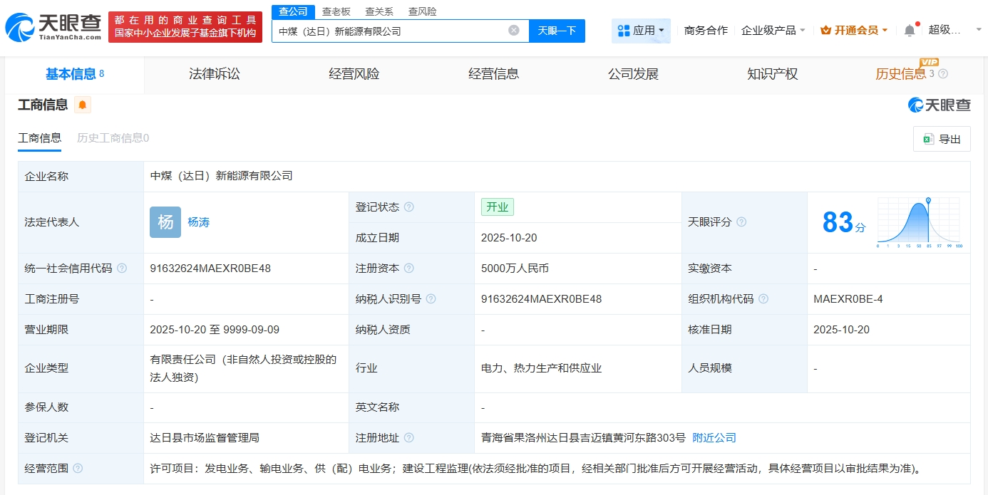 雷达财经讯,天眼查App显示,近日,中煤(达日)新能源有限公司成立,法定代表人为杨涛,注册资本5000万人民币,经营范围为发电业务、输电业务、供(配)电业务,建设工程监理。股东信息显示,该公司由中煤电力有限公司全资持股。