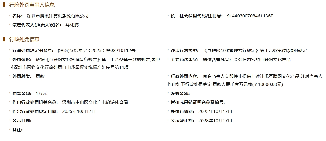 雷达财经讯,天眼查天眼风险信息显示,近日,深圳市腾讯计算机系统有限公司因提供含有危害社会公德内容的互联网文化产品,被深圳市南山区文化广电旅游体育局罚款1万元。