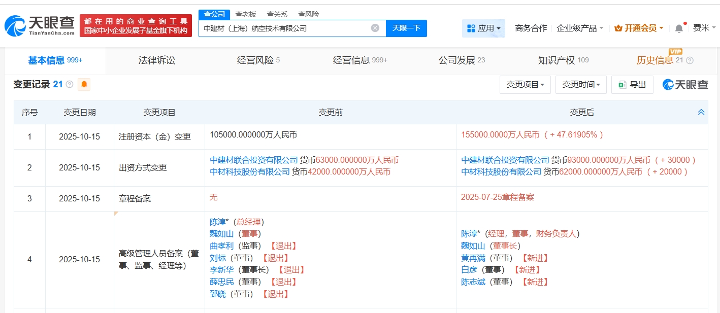 雷达财经讯,天眼查App显示,近日,中建材(上海)航空技术有限公司发生工商变更,注册资本由10.5亿人民币增至15.5亿人民币,增幅约48%,同时多位高管发生变更。