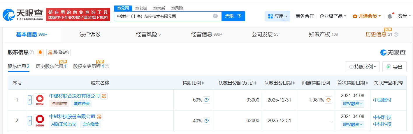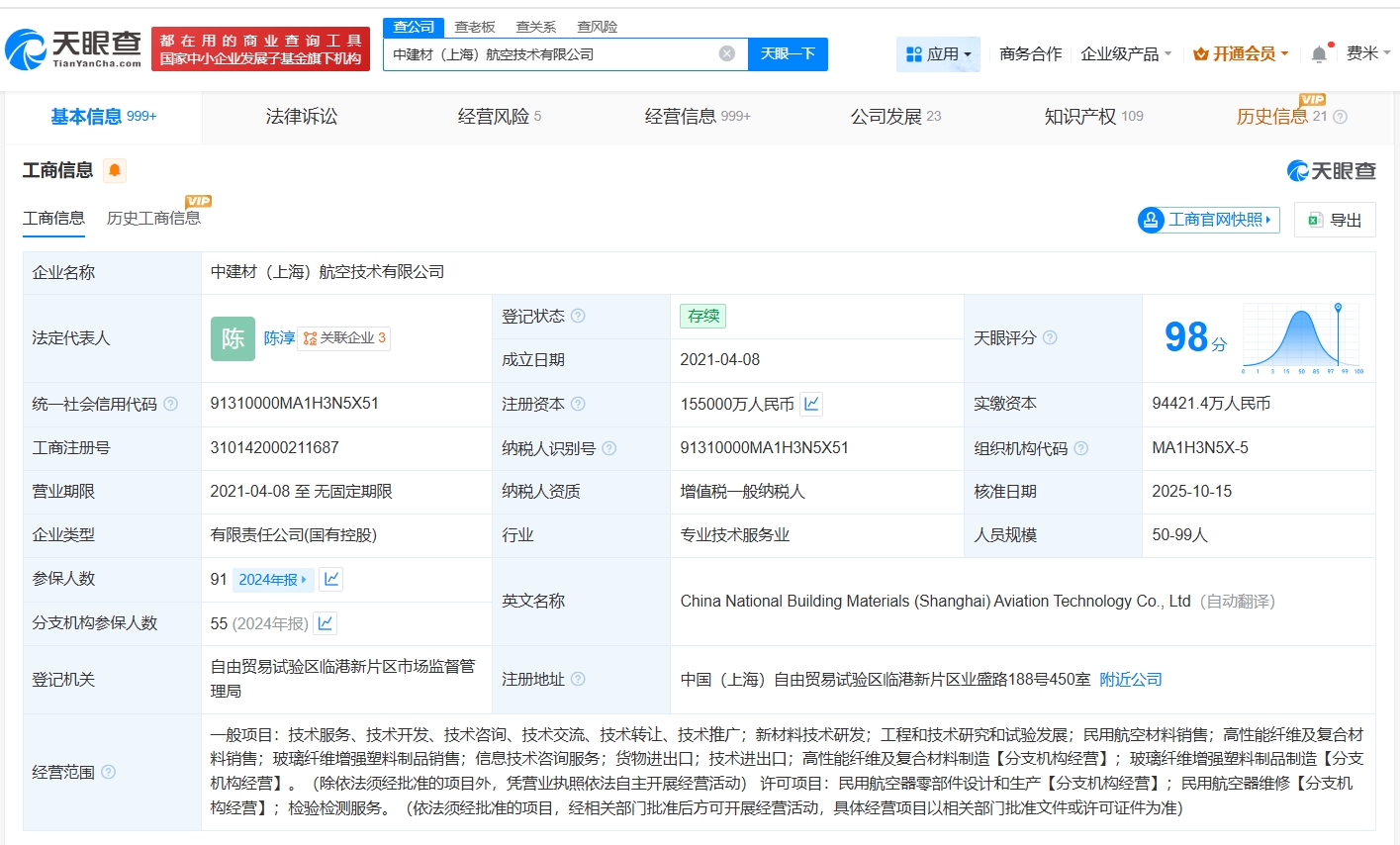 该公司成立于2021年4月,法定代表人为陈淳,经营范围包括新材料技术研发、工程和技术研究和试验发展、民用航空材料销售等,由中建材联合投资有限公司、中材科技(002080)共同持股。