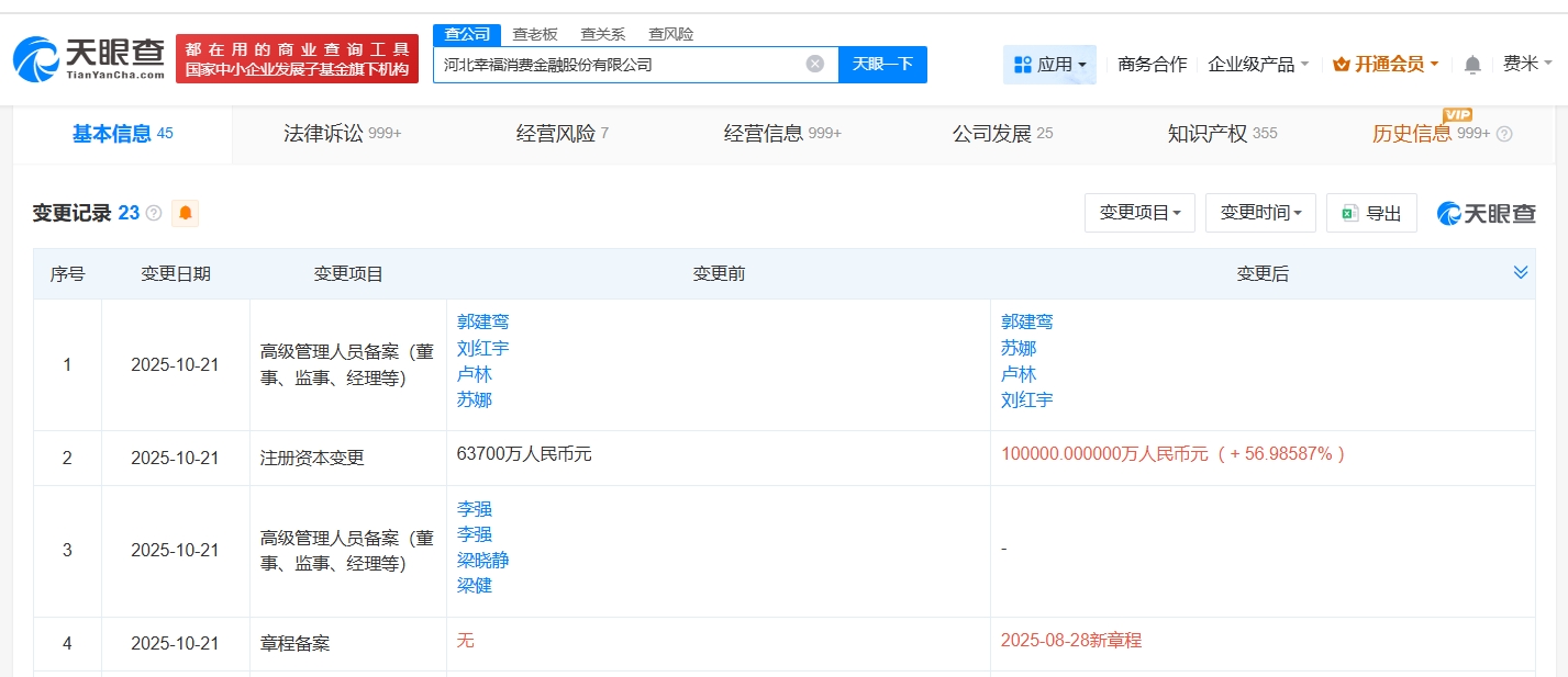 天眼查App显示,近日,河北幸福消费金融股份有限公司发生工商变更,注册资本由6.37亿人民币增至10亿人民币,增幅约57%…