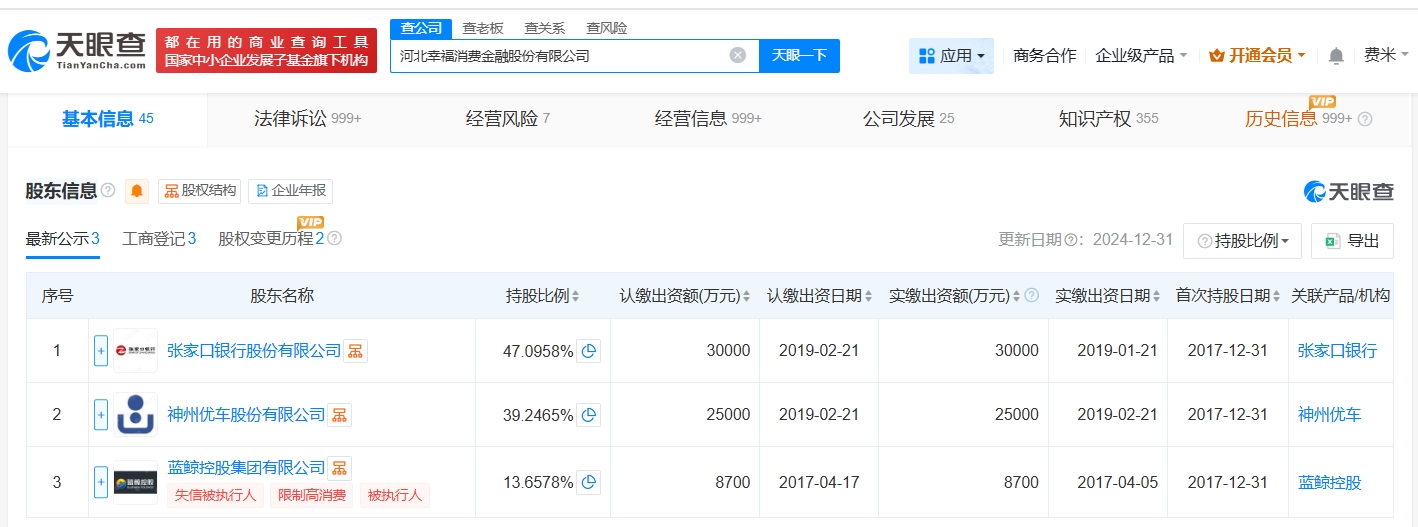 该公司成立于2017年6月,法定代表人为苏娜,经营范围包括发放个人消费贷款、接受股东境内子公司及境内股东的存款、向境内金融机构借款等,由张家口银行股份有限公司、神州优车股份有限公司、蓝鲸控股集团有限公司共同持股。