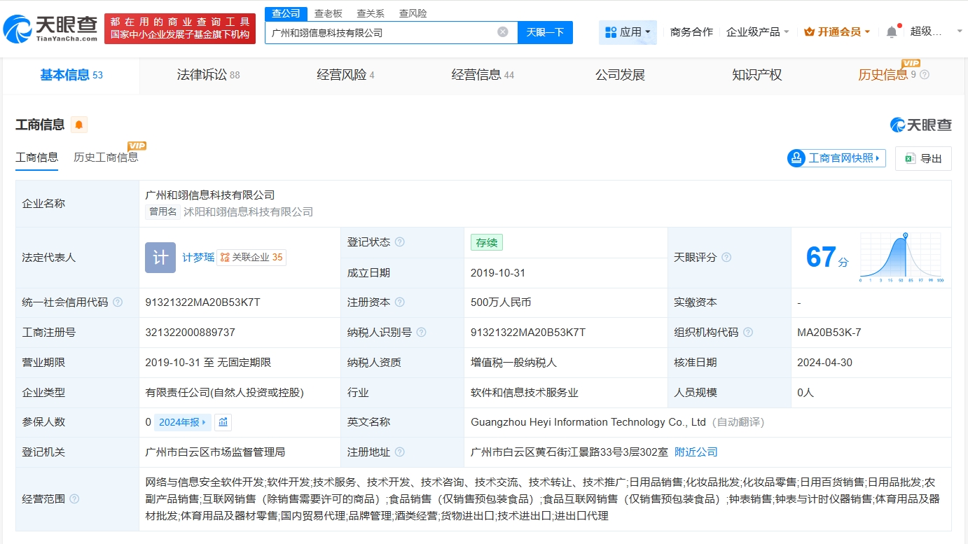 工商信息显示,广州和翊信息科技有限公司成立于2019年10月,法定代表人为计梦瑶,注册资本500万人民币,经营范围包括日用百货销售、互联网销售、国内贸易代理等,由计梦瑶和贾连喜分别持股99%、1%。据报道,此前,该公司曾陷入“假燕窝事件”。