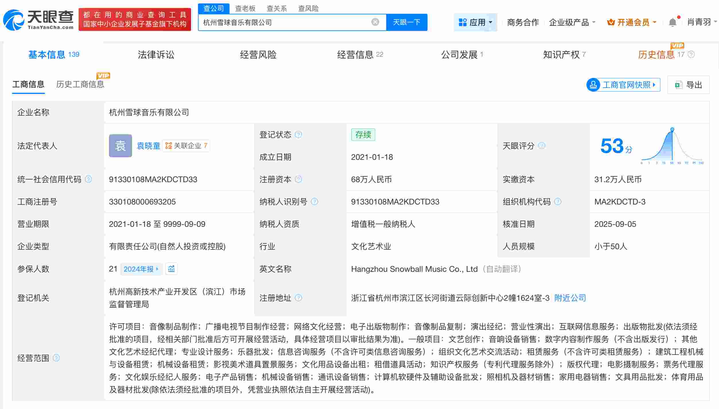 天眼查App显示,杭州雪球音乐有限公司成立于2021年1月,法定代表人为袁晓童,注册资本68万,经营范围包括音像制品制作、广播电视节目制作经营、网络文化经营等。