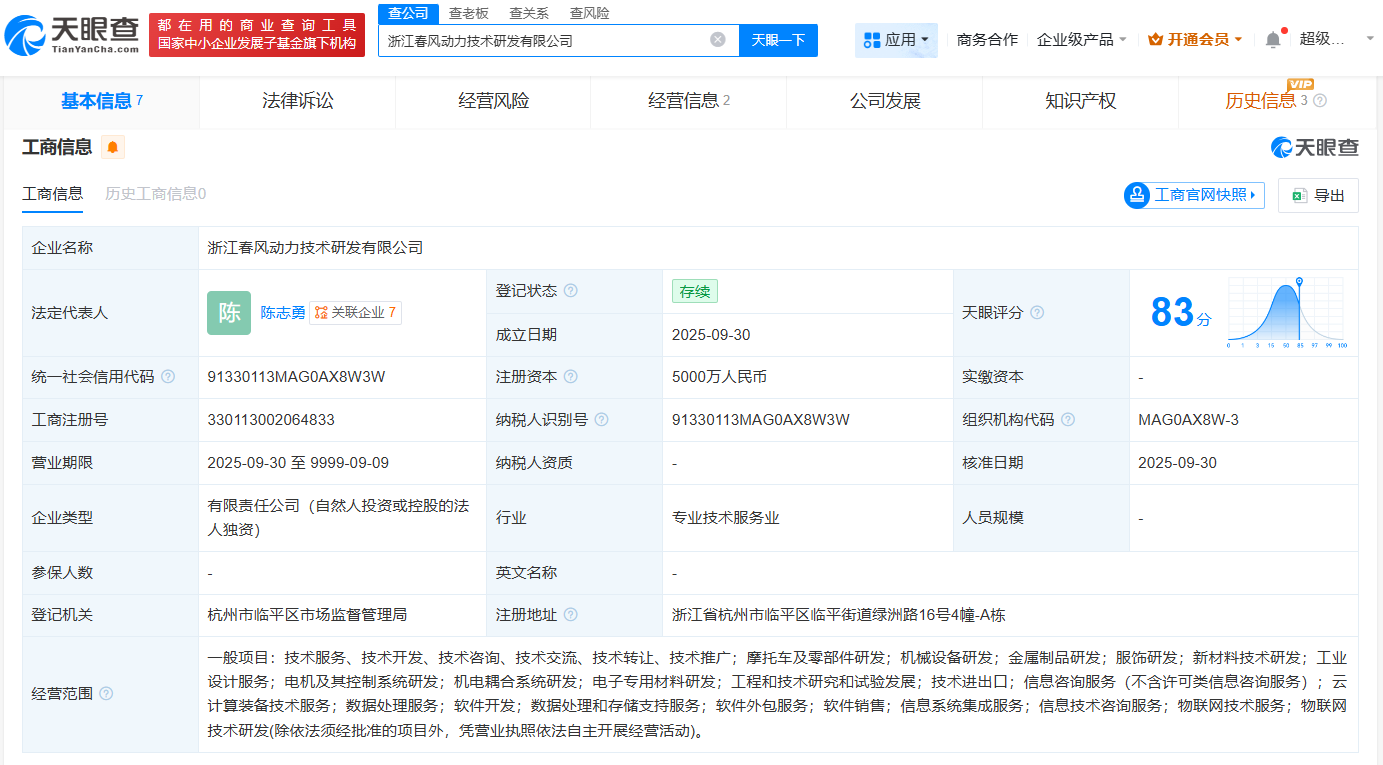 雷达财经讯,天眼查App显示,近日,浙江春风动力技术研发有限公司成立,法定代表人为陈志勇,注册资本5000万人民币,经营范围包括摩托车及零部件研发、机械设备研发、金属制品研发等。股东信息显示,该公司由春风动力(603129)全资持股。