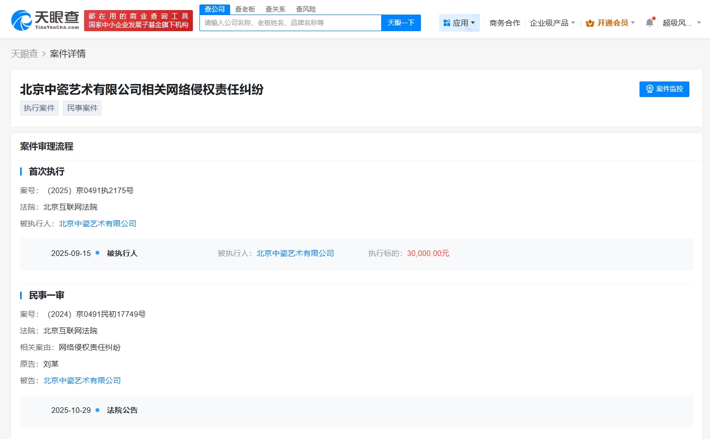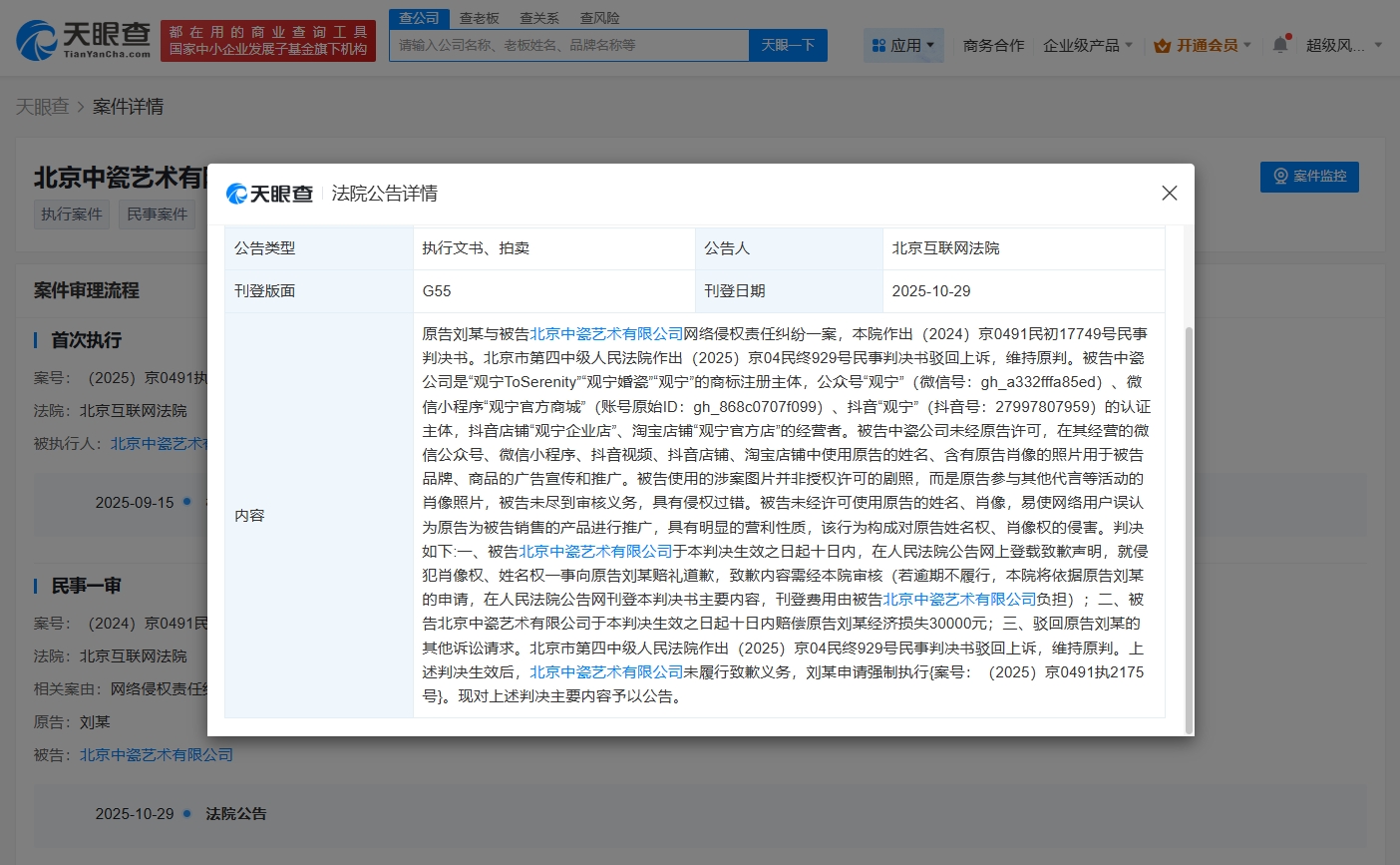 雷达财经讯,天眼查App显示,近日,因北京中瓷艺术有限公司未履行致歉义务,刘诗施(刘诗诗)申请强制执行,北京互联网法院公告刘诗施与该公司网络侵权责任纠纷案件判决书。