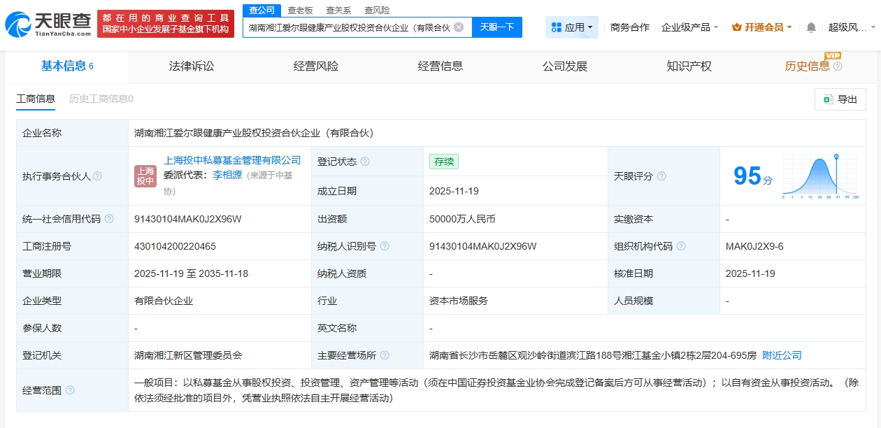 雷达财经讯,天眼查App显示,近日,湖南湘江爱尔眼健康产业股权投资合伙企业(有限合伙)成立,执行事务合伙人为上海投中私募基金管理有限公司,出资额5亿人民币,经营范围为以自有资金从事投资活动,以私募基金从事股权投资、投资管理、资产管理等活动。合伙人信息显示,该合伙企业由湖南湘江新区引导五号股权投资合伙企业(有限合伙)、爱尔医疗投资集团有限公司等共同出资。