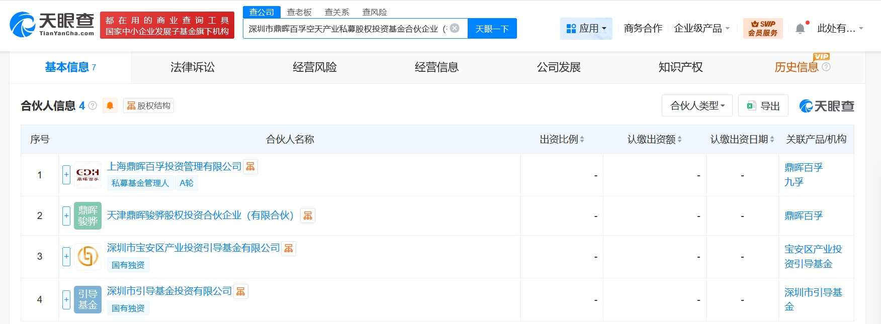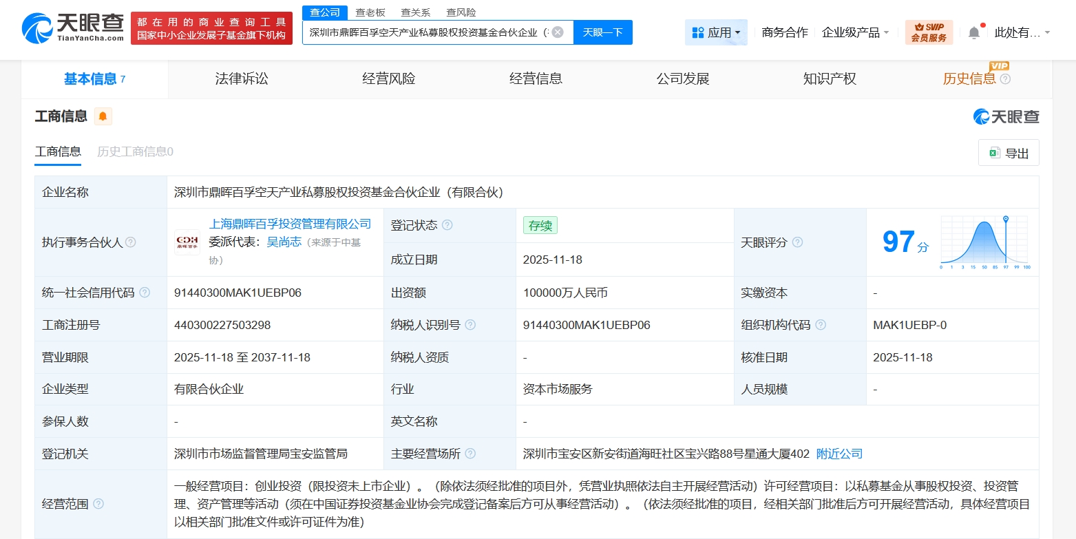 雷达财经讯,天眼查工商信息显示,近日,深圳市鼎晖百孚空天产业私募股权投资基金合伙企业(有限合伙)成立,执行事务合伙人为上海鼎晖百孚投资管理有限公司,出资额10亿人民币,经营范围为创业投资,以私募基金从事股权投资、投资管理、资产管理等活动。合伙人信息显示,该基金由深圳市引导基金投资有限公司、天津鼎晖骏骅股权投资合伙企业(有限合伙)、深圳市宝安区产业投资引导基金有限公司、上海鼎晖百孚投资管理有限公司共同出资。