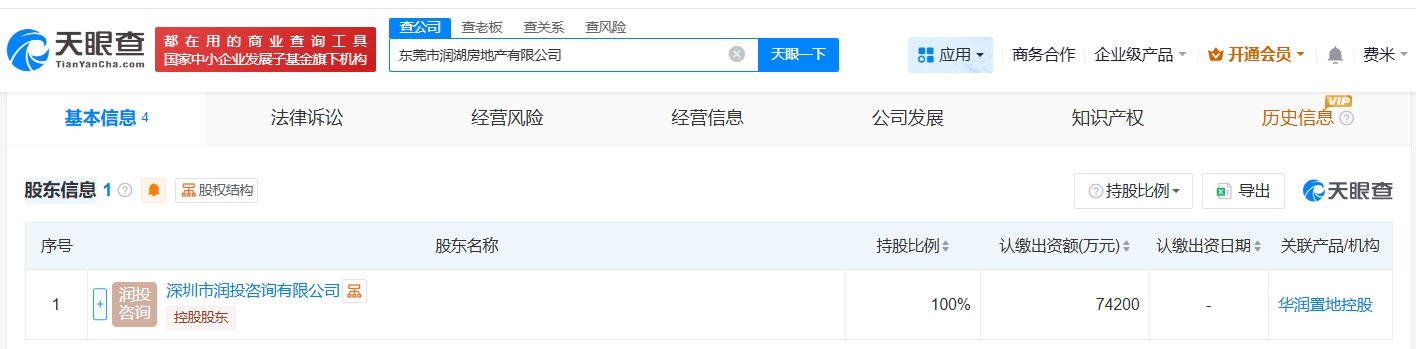 雷达财经讯,天眼查工商信息显示,近日,东莞市润湖房地产有限公司成立,法定代表人为赵肇,注册资本7.42亿人民币,经营范围为房地产开发经营。股东信息显示,该公司由华润置地旗下深圳市润投咨询有限公司全资持股。