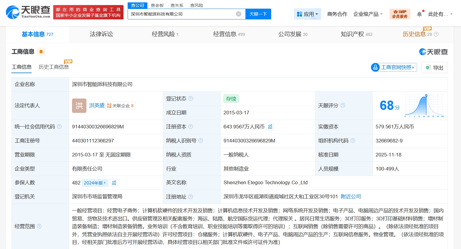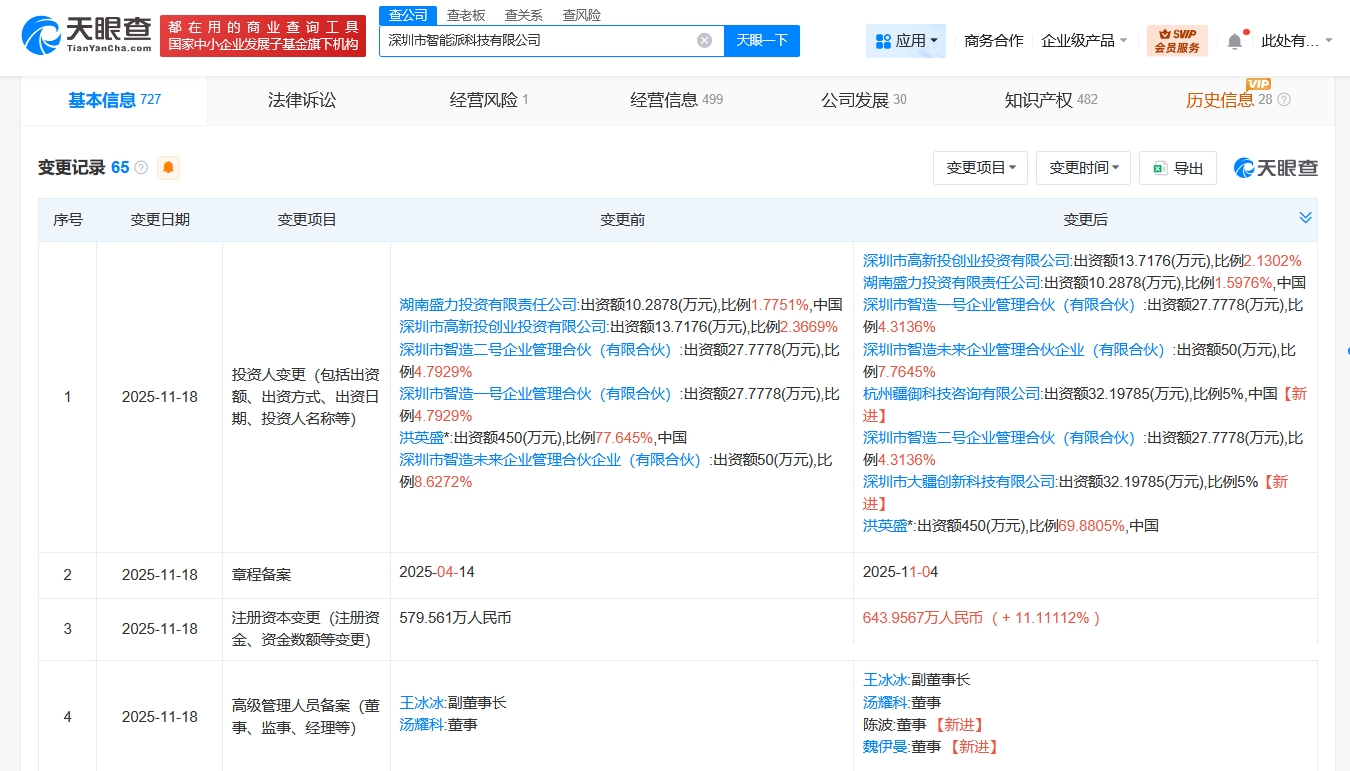 深圳市智能派科技有限公司成立于2015年3月,法定代表人为洪英盛,经营范围含经营电子商务、计算机软硬件的技术开发及销售、计算机信息技术开发及销售、网络系统开发及销售、国内贸易、货物及技术进出口等。股东信息显示,该公司现由洪英盛、深圳市智造未来企业管理合伙企业(有限合伙)及上述新增股东等共同持股。