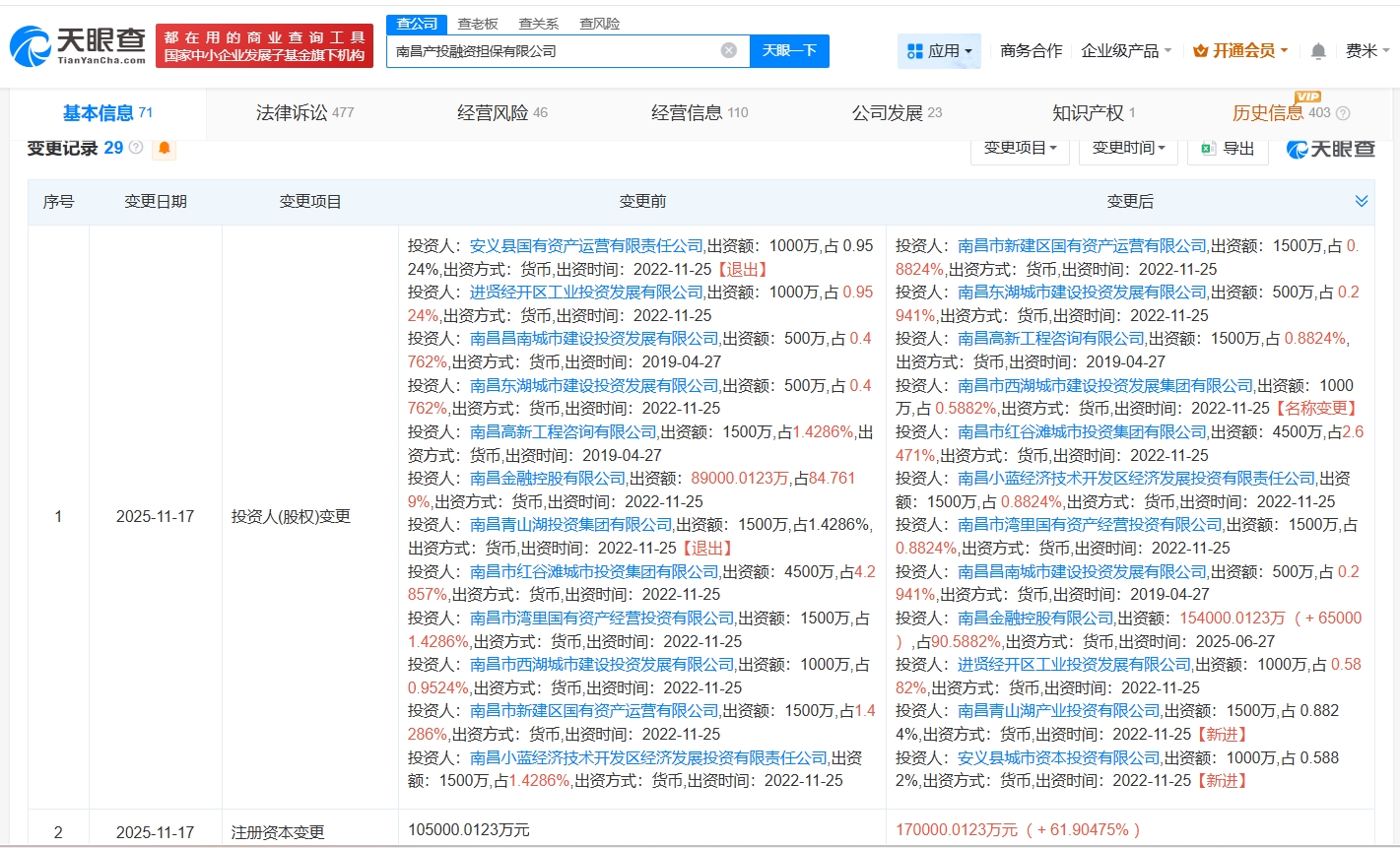 雷达财经讯,天眼查工商信息显示,近日,南昌产投融资担保有限公司发生工商变更,原股东安义县国有资产运营有限责任公司、南昌青山湖投资集团有限公司退出,新增南昌青山湖产业投资有限公司、安义县城市资本投资有限公司为股东,同时,注册资本由约10.5亿人民币增至约17亿人民币,增幅约62%。