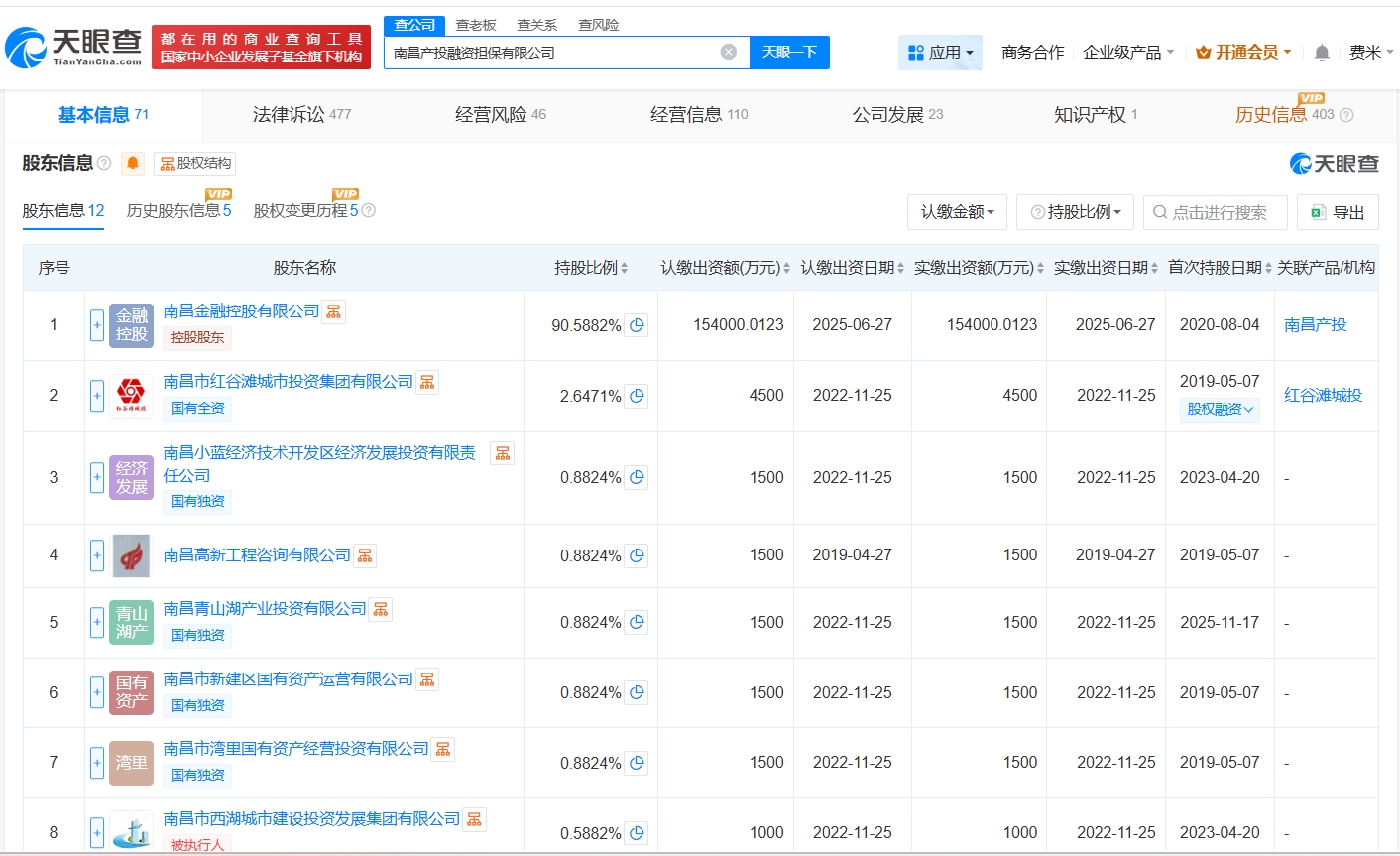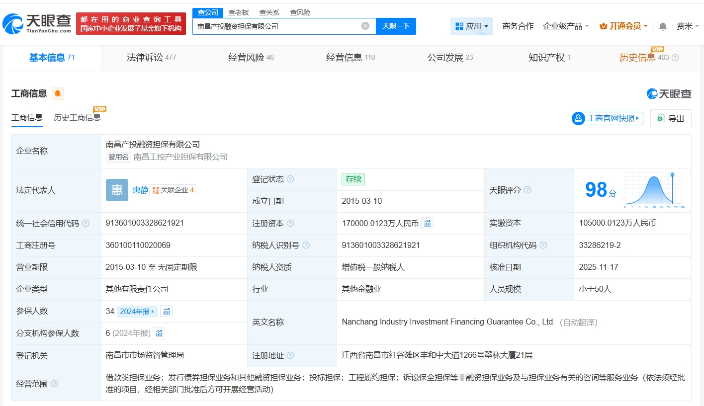 南昌产投融资担保有限公司成立于2015年3月,法定代表人为惠静,经营范围包括借款类担保业务、发行债券担保业务和其他融资担保业务、投标担保、工程履约担保等。股东信息显示,该公司由南昌金融控股有限公司、南昌市红谷滩城市投资集团有限公司及上述新增股东等共同持股。
